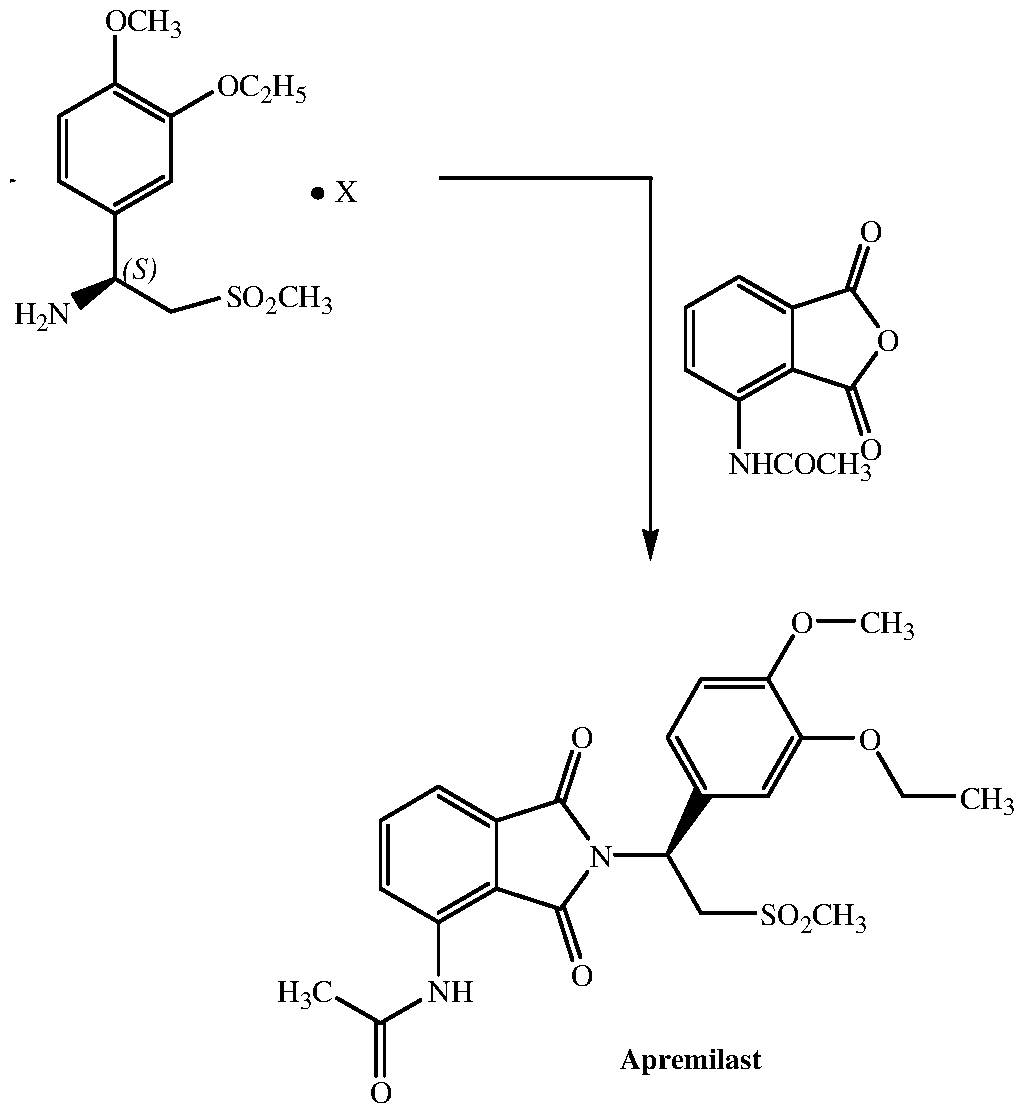 - Apremilast is chemically known as N-[2-[(lS)-l-(3-ethoxy-4-methoxyphenyl)-2- (methylsulfonyl)ethyl]-2,3-dihydro-l,3-dioxo-lH-isoindol-4-yl]acetamide and is shown in Formula I below.