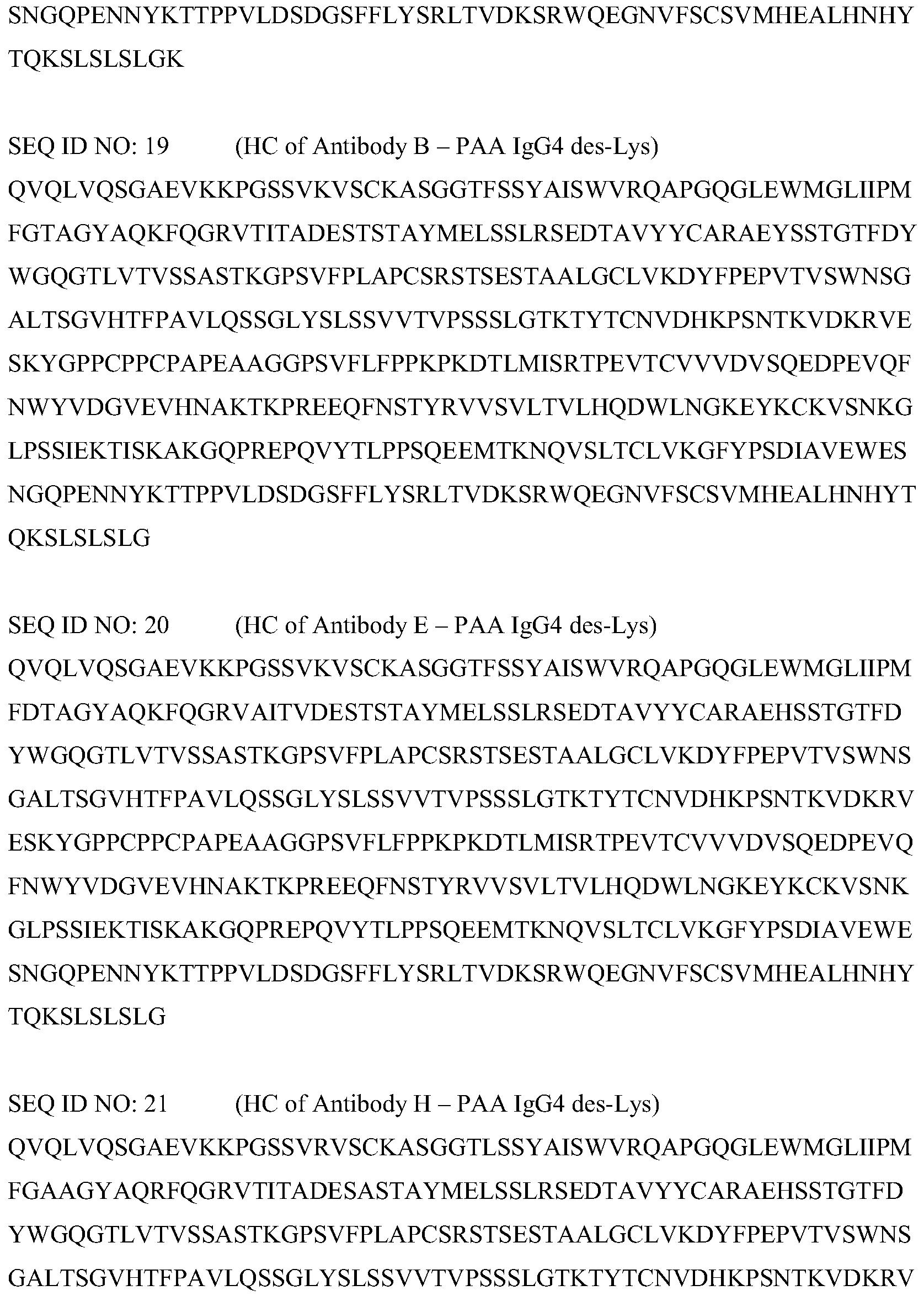 - the present invention provides an antibody, wherein the LC has the amino acid sequence given in SEQ ID NO: 22, and the HC has the amino acid sequence given in SEQ ID NO: 23. In an embodiment, the present invention provides an antibody, wherein the LC has the amino acid sequence given in SEQ ID NO: 22, and the HC has the amino acid sequence given in SEQ ID NO: 24. In an embodiment, the present invention provides an antibody, wherein the LC has the amino acid sequence given in SEQ ID NO: 22, and the HC has the amino acid sequence given in SEQ ID NO: 25.