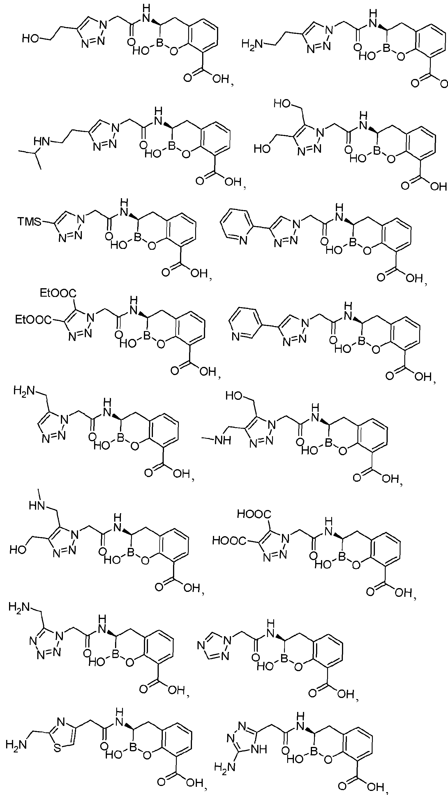 - HMPQPUGUSIJXFW-UHFFFAOYSA-N OB(C(C1)NC(C[n]2nnc(-c3ccc[s]3)c2)=O)Oc2c1cccc2C(O)=O Chemical compound OB(C(C1)NC(C[n]2nnc(-c3ccc[s]3)c2)=O)Oc2c1cccc2C(O)=O HMPQPUGUSIJXFW-UHFFFAOYSA-N 0.000 description 1
