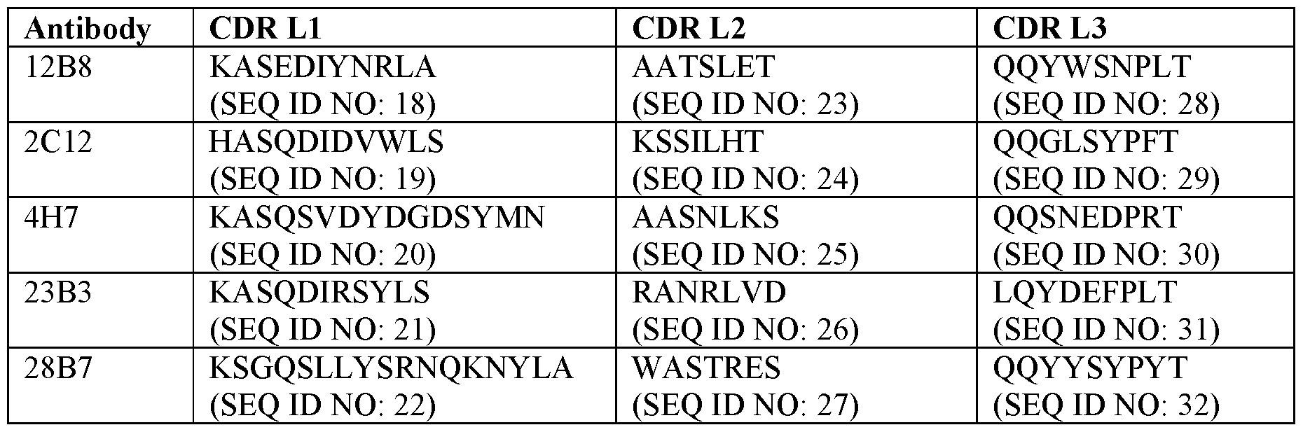 Figure 12 illustrates an example biolayer inferometry experiment. In this example, 2C12 (human IgGl) competes with 23B3, but not with 28B7 or 8C5 (mouse IgG) for binding to recombinant KLB.