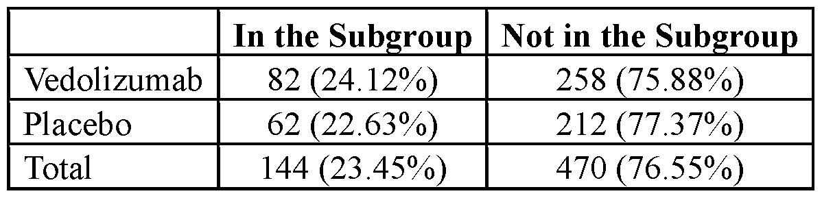 - the present invention relates to methods and kits for treating Crohn’s Disease in an individual, and for identifying the likelihood that an individual suffering from Crohn’s Disease will experience an enhanced treatment effect (e.g.,experience an enhanced clinical response or clinical remission) to treatment with an antagonist of the ⁇ 4 ⁇ 7 integrin, such as an anti- ⁇ 4 ⁇ 7 antibody (e.g., vedolizumab) and/or experience an enhanced treatment effect when treated with the antagonist.