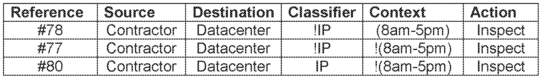 - the intent-based network policies "A” and “B” one dimension (the source dimension) of network policy “A” is excluded and one dimension of network policy “B” (the destination dimension) is excluded, regardless of the classifier and context dimensions for these intent- based network poiicies. That is, for policies #10-#18, the matching criteria of both policy "A” and policy "B” are not met, so there is no action to perform.