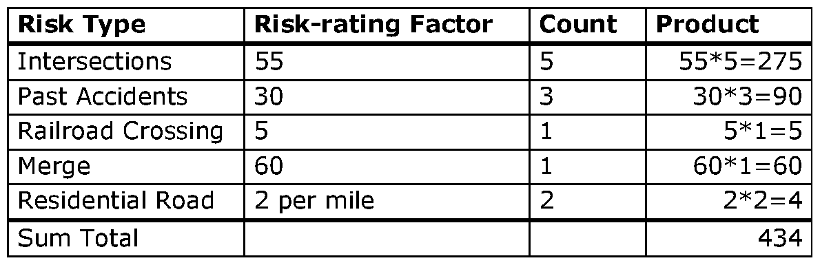 [84] Assuming a route risk value between 0 and 350 (per mile) is categorized as a low-risk route, then the aforementioned 2-mile route's risk value of 217 (i.e., 434 divided by 2) classifies it a low-risk route.