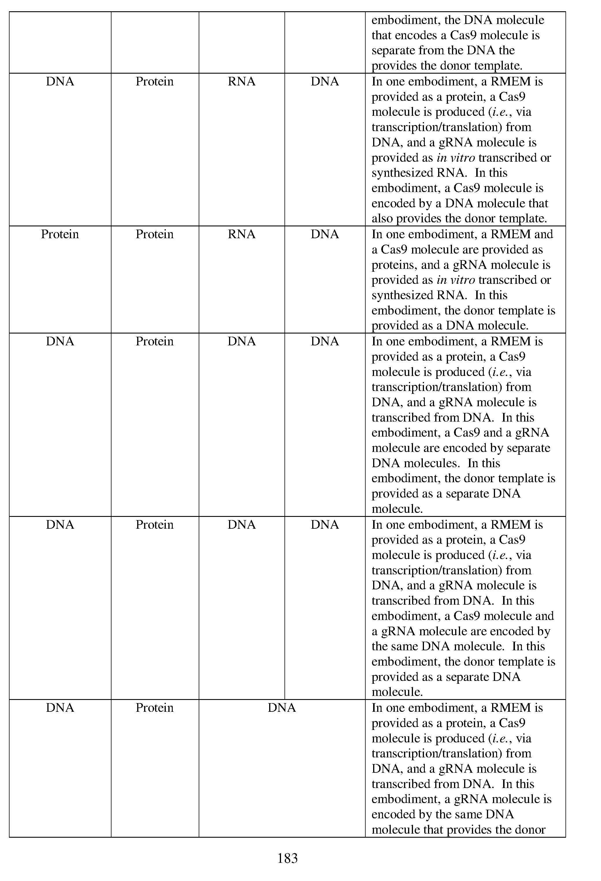 - the gRNA molecule is a gRNA nucleic acid, wherein the RNA-guided nuclease molecule is a RNA-guided nuclease nucleic acid, and wherein the RMEM is a RMEM protein.