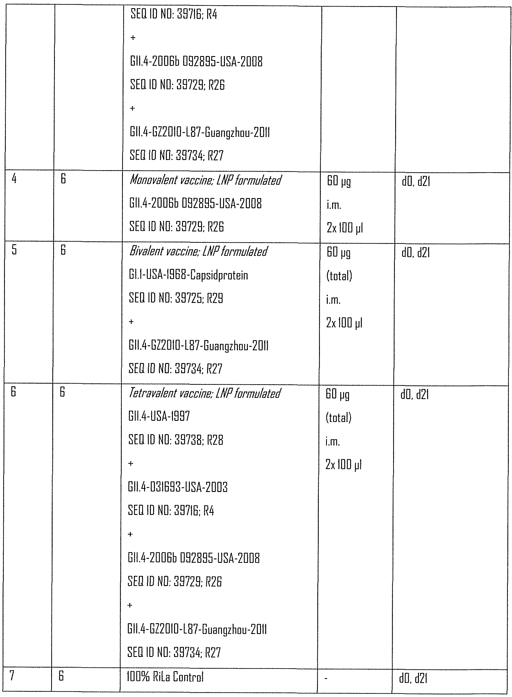 - the underlying objEct of the present invention is therefore to provide a Norovirus vaccine. It is a further preferred object of the invention to provide a Norovirus vaccine, which may be produced at an industrial scale. A further object of the present invention is the provision of a storage-stable Norovirus vaccine. Further object of the underlying invention is to provide mRNA sequences5 coding for antigenic peptides or proteins derived from a protein of a Norovirus or a fragment or variant thereof for the use as a vaccine for prophylaxis or treatment of Norovirus infections. Furthermore, it is the object of the present invention to provide an effective Norovirus vaccine which can be stored without cold chain and which enables rapid and scalable vaccine production.