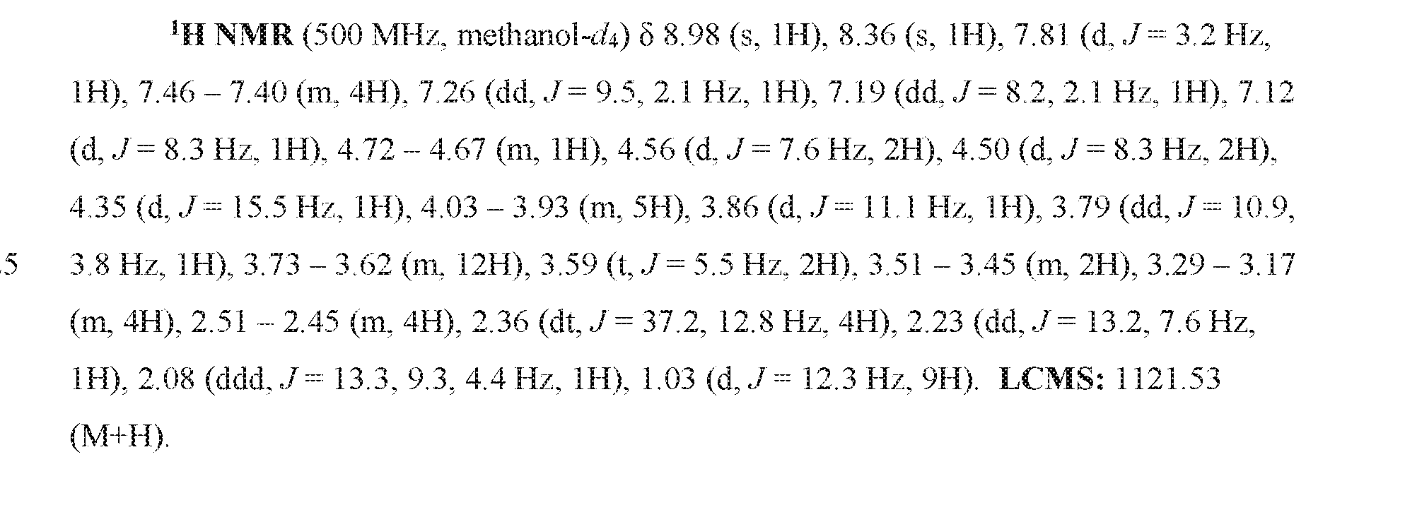 1H NMR (500 MHz, methanol-d4^^į^ ^^^^^^^V^^^+^^^^^^^^^G^^J=6.1, 1H), 8.30 (s, 1H), 7.96 (s, 1H), 7.83 (d, J=6.2, 1H), 7.52– 7.41 (m, 1H), 7.00 (d, J=8.1, 2H), 6.81 (s, 2H), 4.99 (dd, J=12.5, 5.3, 1H), 4.50 (d, J=4.8, 2H), 3.96 (s, 1H), 3.94 (s, 6H), 3.87 (s, 2H), 3.70 (s, 3H), 3.70– 3.60 (m, 6H), 3.56 (q, J=4.8, 2H), 3.47– 3.32 (m, 4H), 2.92 (s, 3H), 2.83 (ddd, J=19.0, 13.8, 5.3, 1H), 2.71 (d, J=17.6, 2H), 2.11– 2.01 (m, 1H). LCMS: 784 (M+H). Example 4. Biological Data from ligand displacement assay