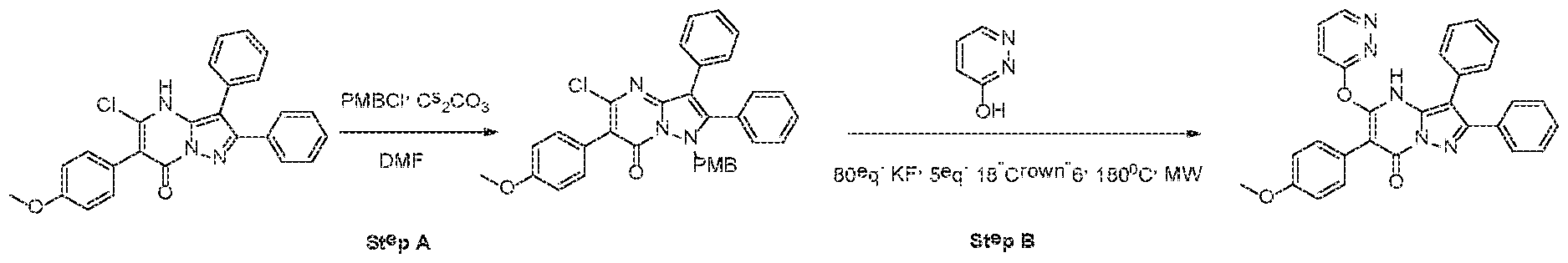 [001859] The mixture of 5-chloro-l-(4-methoxybenzyl)-6-(4-methoxyphenyl)-2,3- diphenylpyrazolo[l,5-a]pyrimidin-7(1H)-one (200mg, 0.365mmol), KF (1.7g, 29mmol) and 18-Crown-6 (481mg, 1.825mmol) in NMP (3mL) was stirred at 180 °C for 4h under microwave irradiation in a sealed tube to afford 6-(4-methoxyphenyl)-2,3-diphenyl-5- (pyridazin-3-yloxy)pyrazolo[l,5-a]pyrimidin-7(4H)-one.
