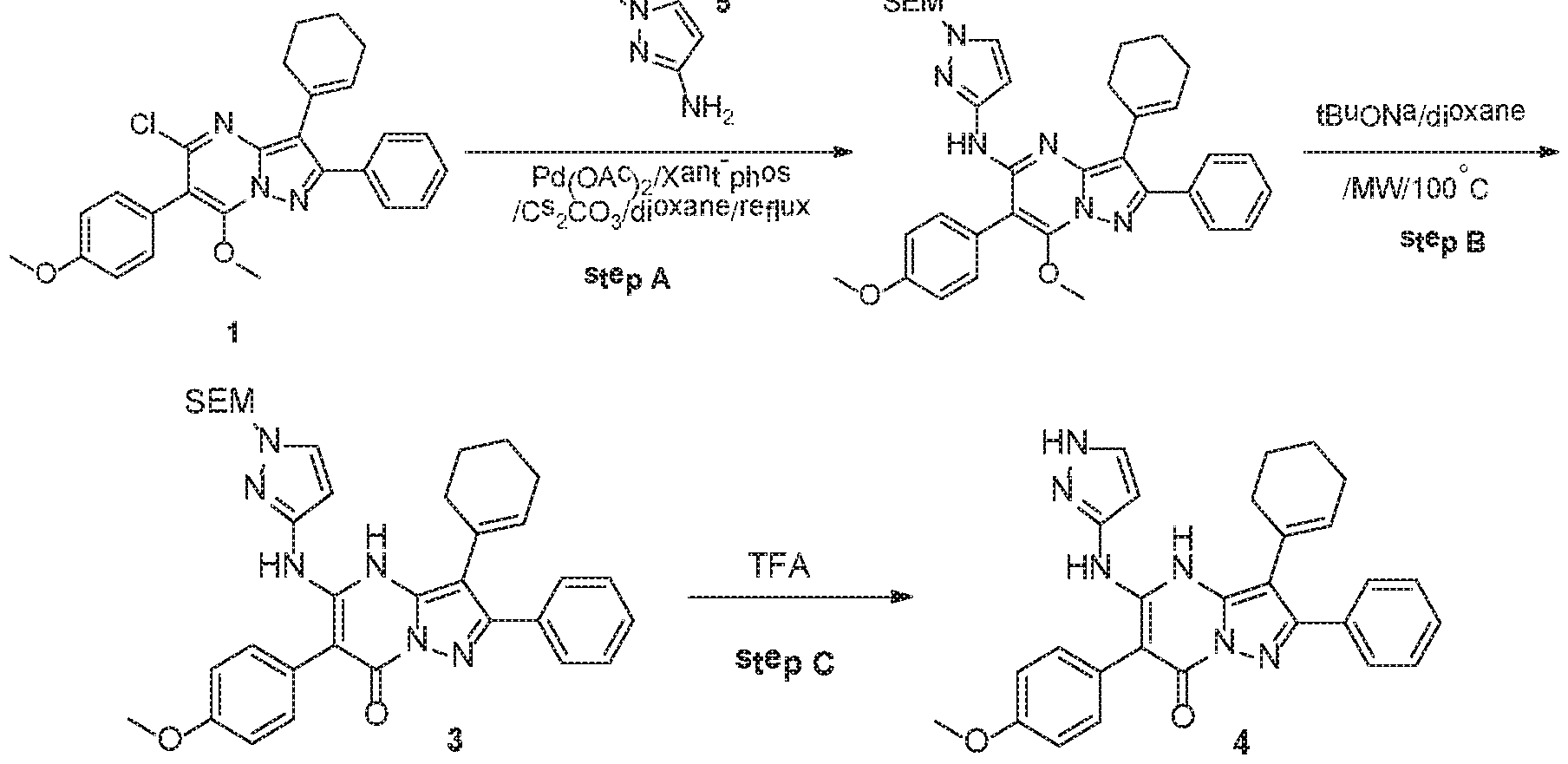 [001866] Step A : 7-methoxy-6-(4-methoxyphenyl)-N,2,3-triphenylpyrazolo[l,5- a]pyrimidin-5-amine