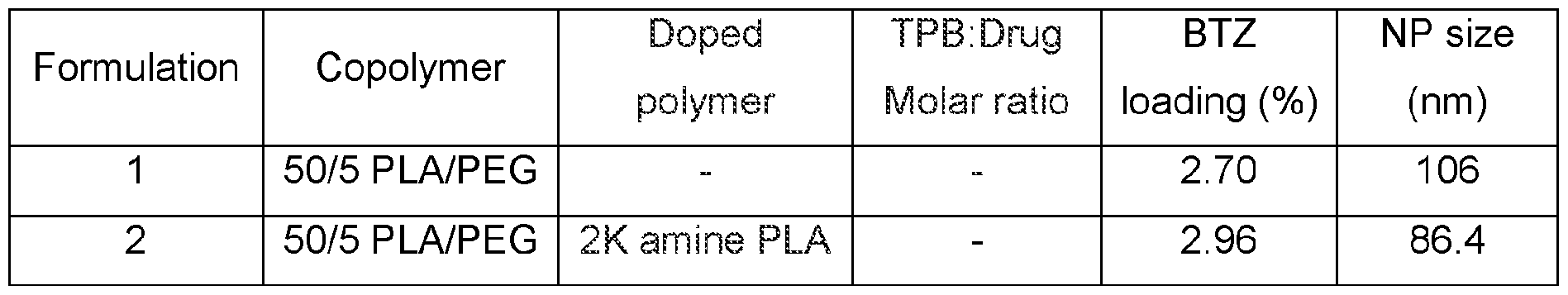 (4) incorporation of sodium tetraphenyl borate (TPB) with low and high molecular weight copolymers (16/5 and 50/5 PLA/PEG). It is believed that TPB may interact with bortezomib resulting in a decrease in drug solubility followed by slower drug release.