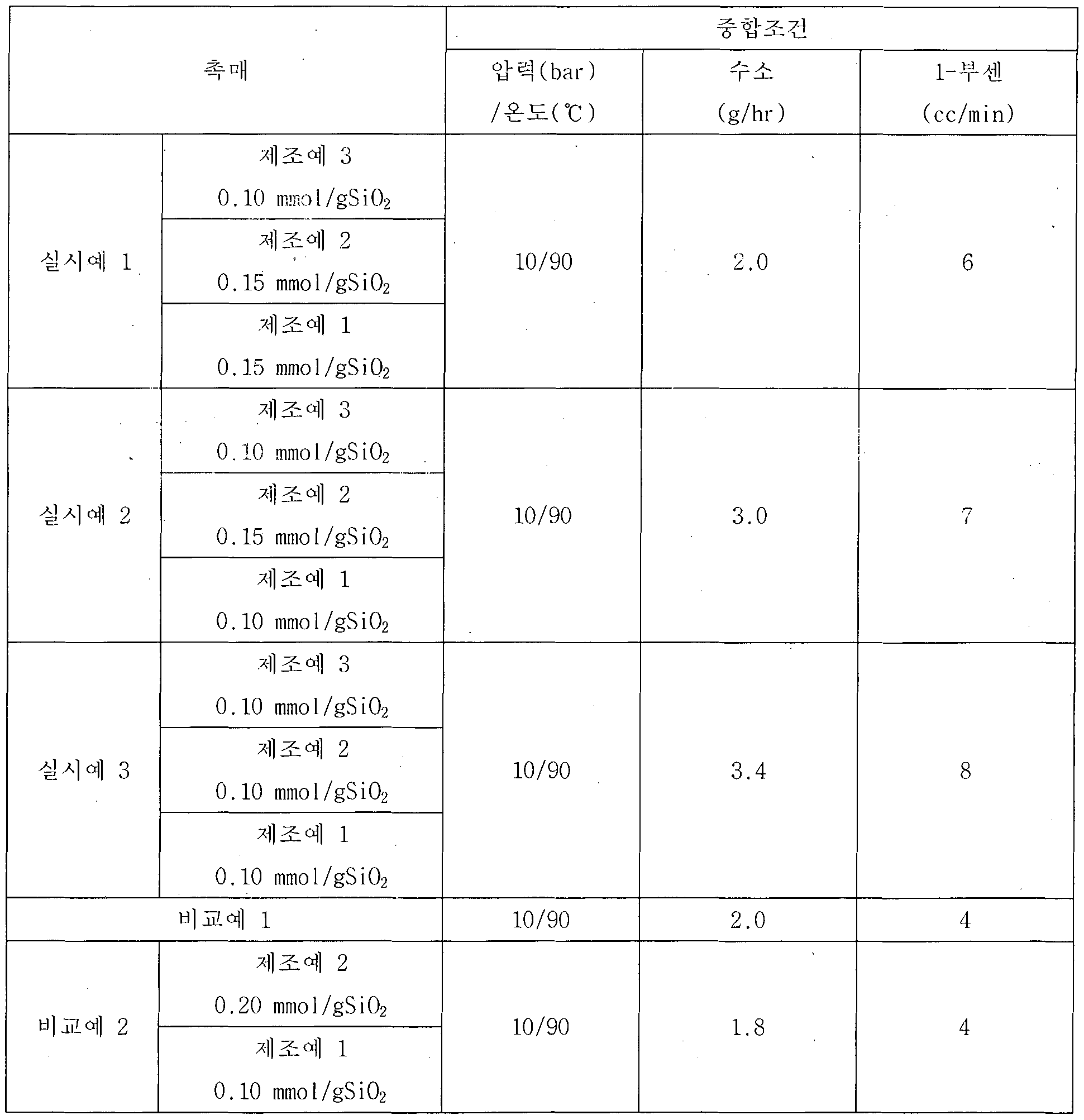 상기 실시예에 각각에서 제조한 각각의 흔성 담지 메탈로센 촉매를 CSTR 연속 중합기 (반응기 부피 50 L)에 투입하여 올레핀 중합체를 제조하였다. 공단량체로는 1-부텐을 사용하였고, 반응기 압력은 10 bar로 증합 온도는 90°C로 유지하였다. Each of the common supported metallocene catalysts prepared in each of the above examples was introduced into a CSTR continuous polymerizer (reactor volume 50 L) to prepare an olefin polymer. As comonomer, 1-butene was used, and the reactor pressure was maintained at 10 bar and the deposition temperature was maintained at 90 ° C.