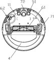 The driving wheel module 71 may include a travel wheel, a drive motor and a control circuit for controlling the drive motor. The driving wheel module 71 may also be connected to a circuit for measuring the drive current and an odometer. The driving wheel module 71 is detachably connected to the main body 1 for easy disassembly and maintenance. The driving wheel may have an offset drop suspension system. The driving wheel is movably fastened, for example, rotatable attached, to the main body 1 and receives a spring offset that is biased downward and away from the main body 1. The spring offset allows the driving wheel to maintain contact and traction with the ground with a certain ground force. At the same time the robot's cleaning elements (such as roller brush, etc. ) also contact the ground with a certain pressure.