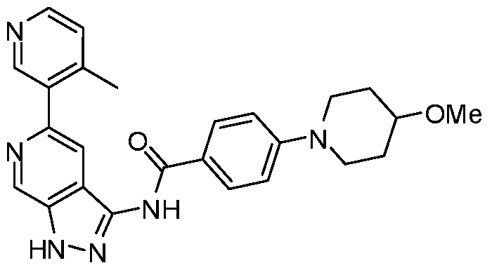 - JSVSQZGENRXFNL-UHFFFAOYSA-N CN(CC1)CCN1c(cc1)ccc1C(Nc1n[nH]c2c1cc(-c1cnccc1OC)nc2)=O Chemical compound CN(CC1)CCN1c(cc1)ccc1C(Nc1n[nH]c2c1cc(-c1cnccc1OC)nc2)=O JSVSQZGENRXFNL-UHFFFAOYSA-N 0.000 description 1