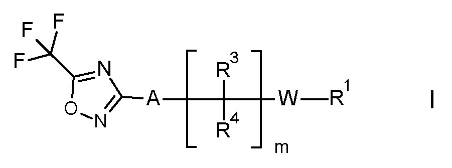 - phenyl refers to an aromatic ring systems incuding six carbon atoms (commonly referred to as benzene ring. In association with the group A the term “phenyl” is to be interpreted as a benzene ring or phenylene ring, which is attached to both, the oxadiazole moiety and the -CR 3 R 4 - or W group.