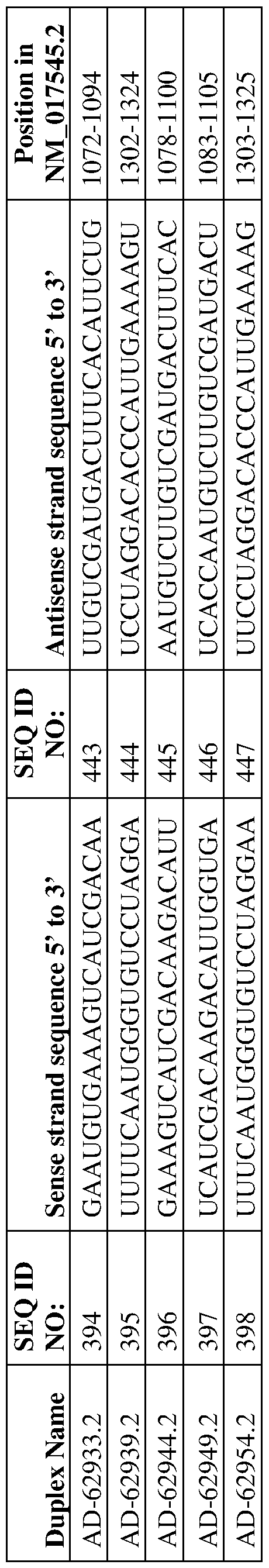 - the present invention provides a double stranded ribonucleic acid (dsRNA) agent for inhibiting expression of lactic acid dehydrogenase A (LDHA) in a cell, wherein said dsRNA agent comprises a sense strand and an antisense strand, the antisense strand comprising a region of complementarity which comprises at least 15 contiguous nucleotides differing by no more than 3 nucleotides from any one of the antisense sequences listed in any one of Tables 2-5.
