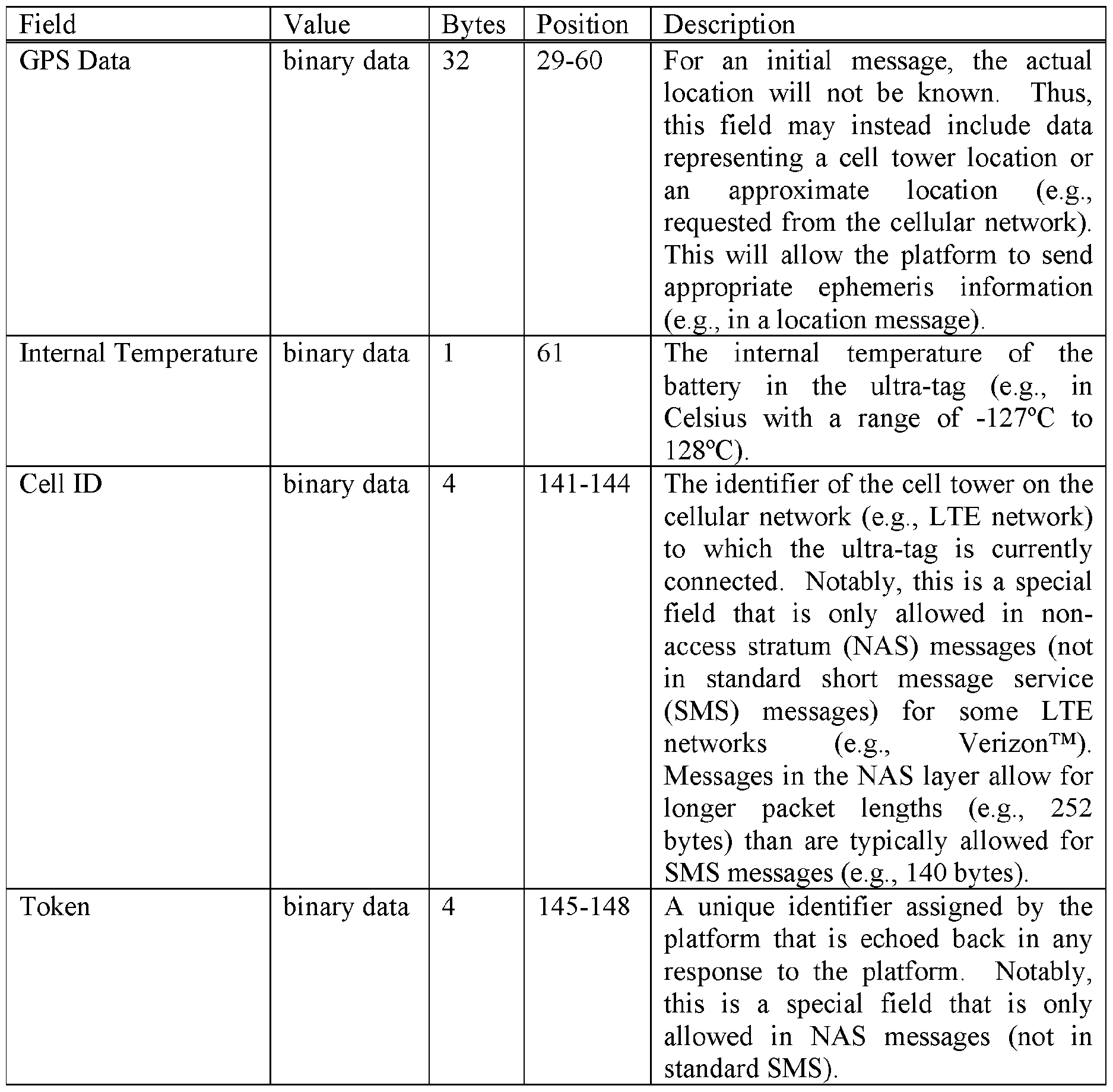 [66] In an embodiment, the report that is transmitted at each reporting interval comprises: (1) an identifier of the ultra-tag 130 (e.g., an International Mobile Subscriber Identity (IMSI) or other serial number); (2) tag revision number and firmware revision number; (3) time of the report (e.g., a timestamp in case the report is held up for some period, for example, in the cellular network); (4) battery information (e.g., battery status, such as remaining battery life); (5) temperature inside the ultra-tag 130 (e.g., used as part of a battery calculation); and/or (6) GPS satellite data from GPS receiver 370 in ultra-tag 130.