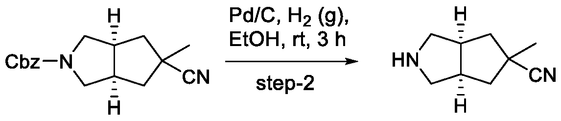 To a stirred solution of benzyl (3aR,6aS)-5-cyano-5- methylhexahydrocyclopenta[c]pyrrole-2(1H)-carboxylate (1 g, 3.51 mol; from the synthesis of Intermediates A and B, Step 8) in EtOH (30 mL) was added Pd/C (0.3 g, 30% w/w) under N2 atm. The reaction mixture was stirred at room temperature under H2 atm for 3 h. Progress of the reaction was monitored by TLC, which showed complete consumption of starting material. The reaction mixture was filtered through a celite bed followed by EtOH wash (80 mL). The filtrate was evaporated under vacuum to dryness. The residue was triturated with diethyl ether to afford (3aR,6aS)-5-methyloctahydrocyclopenta[c]pyrrole-5-carbonitrile (0.5 g, crude) as a sticky brown colored solid diastereomeric mixture (ratio ~ 3:1 by LCMS) which was used for the next step without further purification