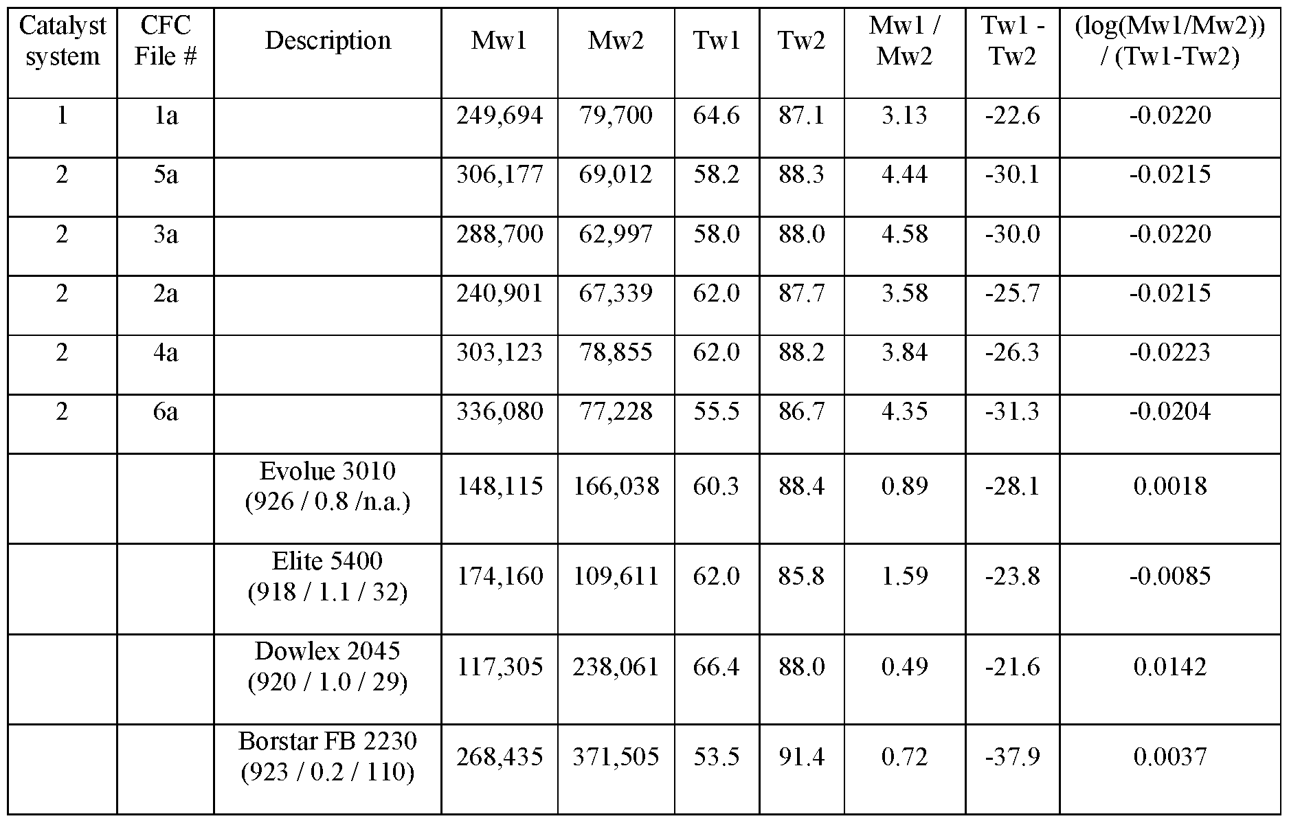 - the BOCD Index defined by equation above may be in the range of 1 to 5, preferably 2 to 4, more preferably 2 to 3.5. See, also, figures 1 and 2 of the '593 Patent (characterizing BOCD polymer structures using GPC-FTIR data).