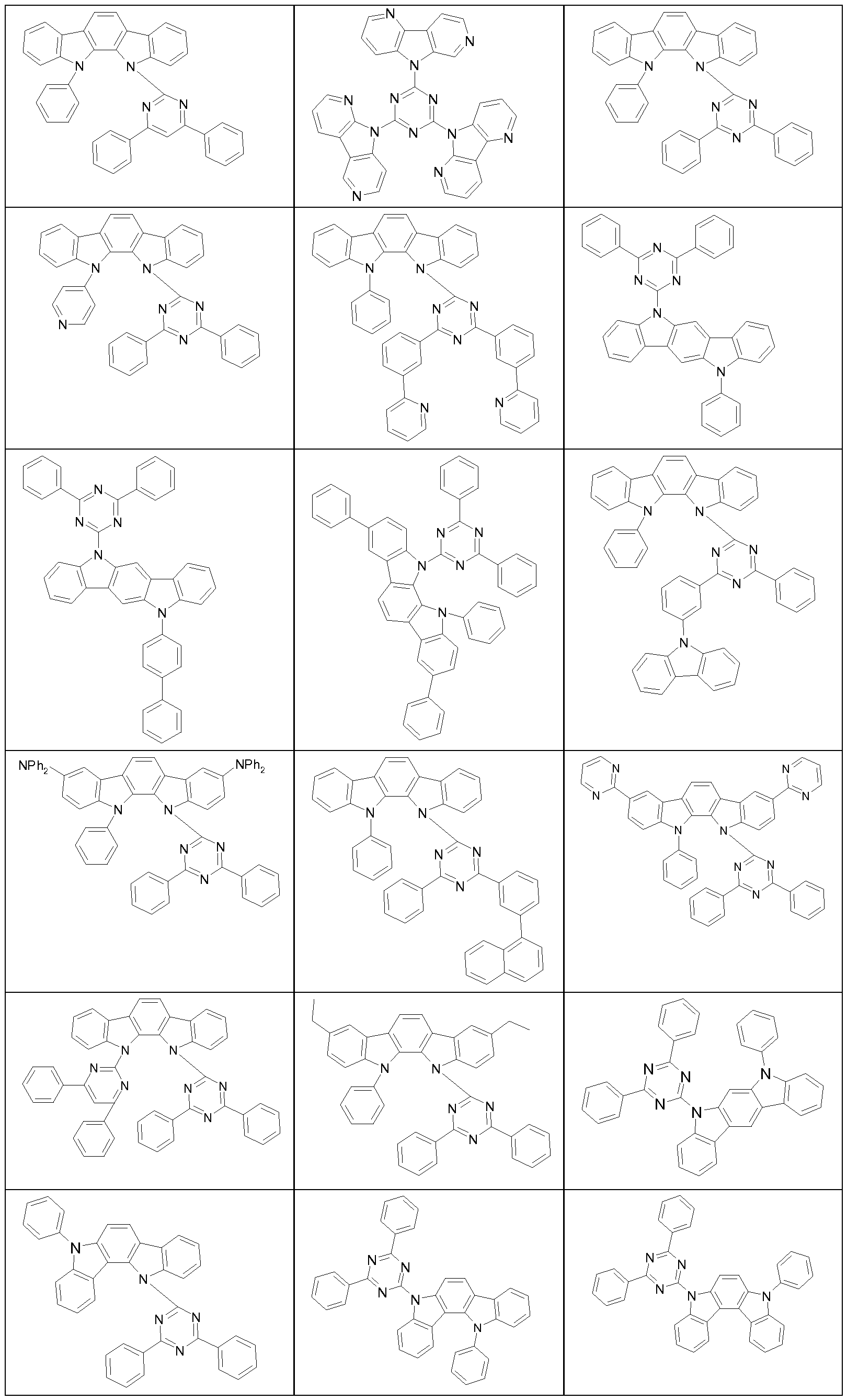 Beispiele für Carbazolderivate, welche je nach Substitutionsmuster als loch- oder elektronentransportierende Matrixmaterialien eingesetzt werden können, sind die folgenden Strukturen: