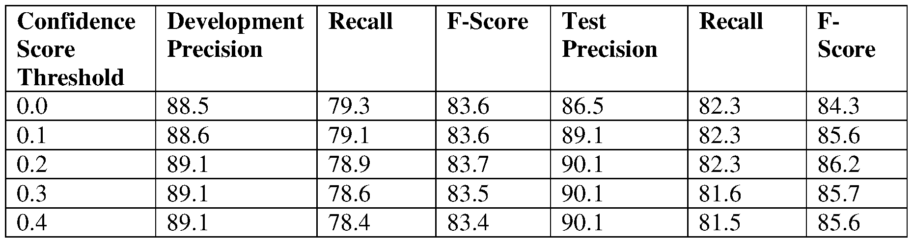 - FIG. 8 depicts a chart indicating a performance of a chemical entity recognition system based on precision, recall, and F-score according to one or more embodiments shown and described herein;