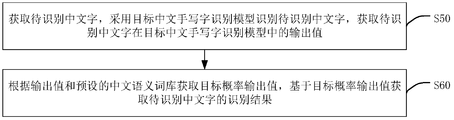 步骤S50-S60,采用目标中文手写字识别模型识别待识别中文字,结合输出值和预设的中文语义词库获取待识别中文字的识别结果。采用该目标中文手写字识别模型本身拥有较高的识别精确度,再结合中文语义词库进一步提高中文手写的识别准确率。In steps S50-S60, the target Chinese handwriting recognition model is used to recognize the Chinese characters to be recognized, and the output value and the preset Chinese semantic thesaurus are used to obtain the recognition results of the Chinese characters to be recognized. Using the target Chinese handwriting recognition model itself has high recognition accuracy, combined with the Chinese semantic thesaurus to further improve the accuracy of Chinese handwriting recognition.