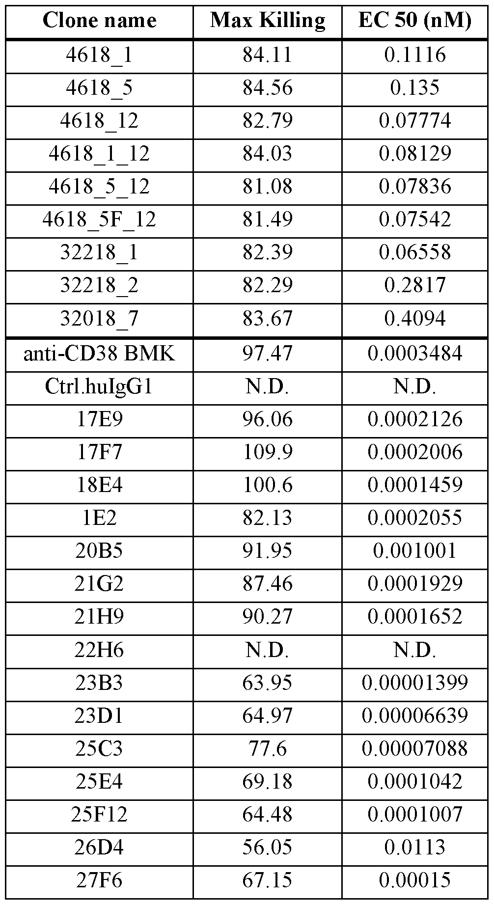 Table 27. ADCC activity of anti-CD38 antibodies on HuNSl cells (N.D. = not determined)