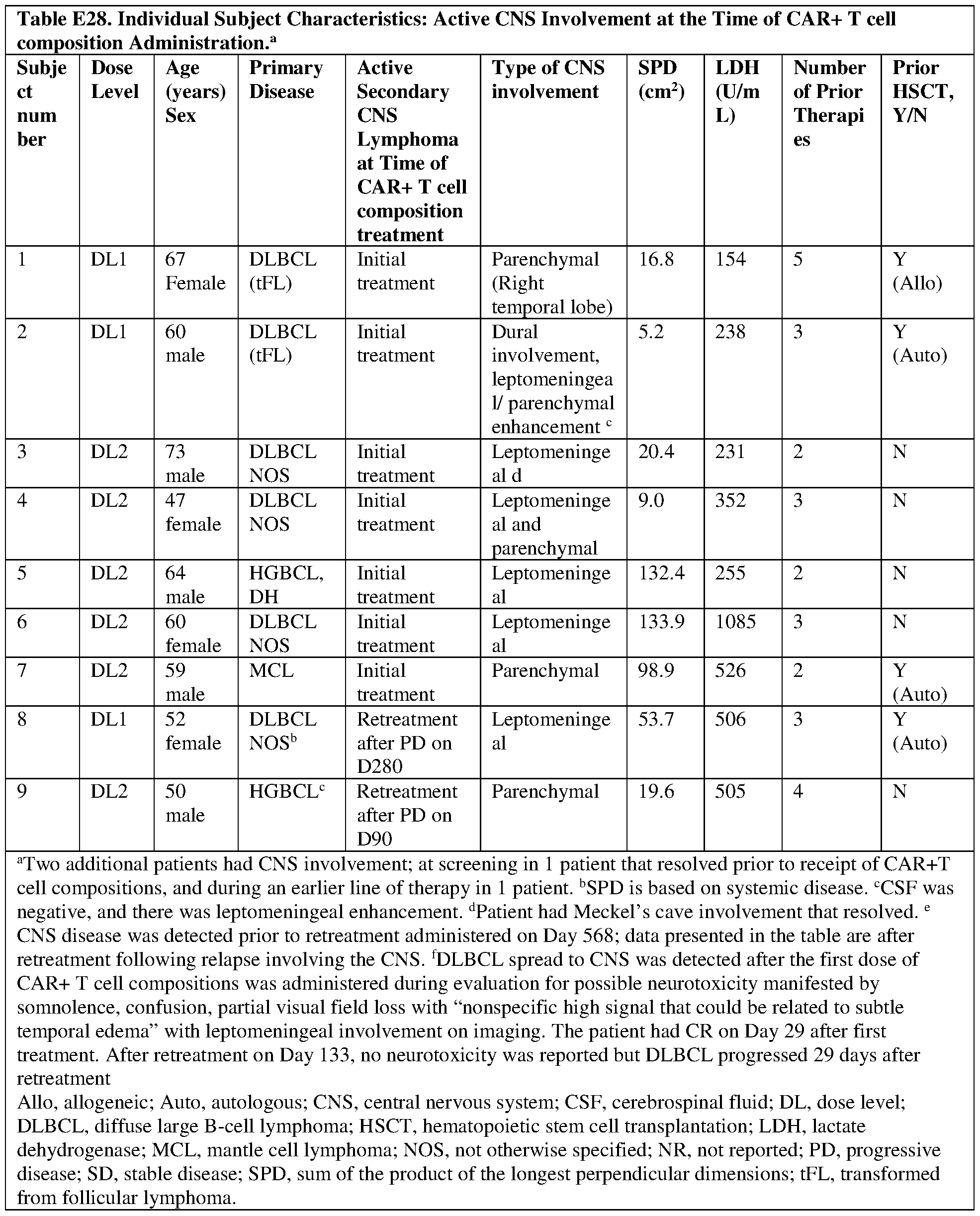 Table E34A). Eligible subjects for treatment also included those with positron emission tomography (PET)-positive disease, histological confirmation of diagnosis at last relapse (e.g., having enough tumor material must be available for central confirmation of diagnosis, otherwise a new tumor biopsy is mandated), an ECOG PS of 0, or 1, or 2, and/or adequate vascular access for leukapheresis procedure (either peripheral line or surgically-placed line). Subjects who have previously received administration of T cells expressing the same anti-CD 19 CAR as described above and achieved a complete response and had relapsed were eligible for retreatment.