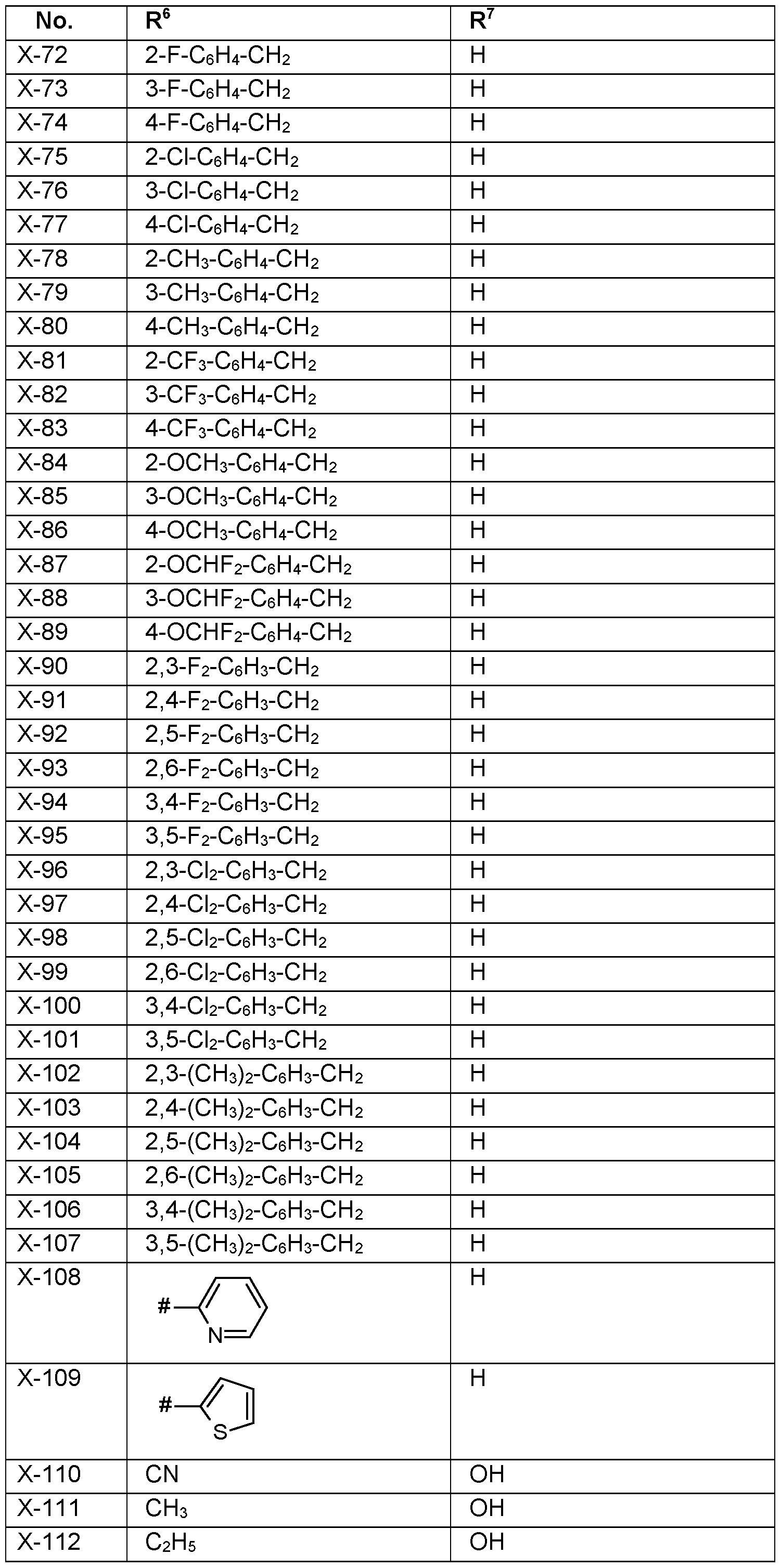- R 7 is in each case independently selected from hydrogen, OH, halogen, CN, CrCe-alkyl, C 2 - Cs-alkenyl, C 2 -Cs-alkynyl, CrCs-halogenalkyl, C 2 -Cs-halogenalkenyl, C 2 -C 8 - halogenalkynyl, O-CrCs-alkyl, 0-C 2 -Cs-alkenyl, 0-C 2 -Cs-alkynyl, C 3 -C 6 -cycloalkyl, O-C 3 - C 6 -cycloalkyl, CH 2 -C 3 -C 6 -cycloalkyl, C 3 -C 6 -cycloalkenyl, 0-C 3 -C 6 -cycloalkenyl, CH 2 -C 3 -C 6 -cycl
