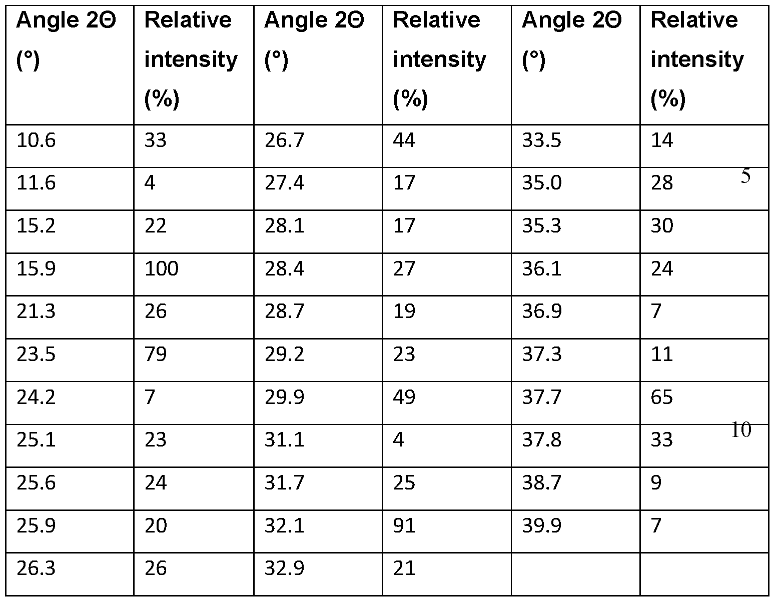 Table 3a: Key PXRD peaks to characterize crystalline material of Example 6, Form 1 and Example 10, Form 1