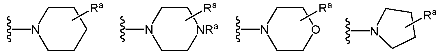 - the present invention provides compounds wherein R X is selected from H, [0043] wherein each of R Xa , R Xb , R Xc , and R Xd is H, halo, R Xm , or R Xn ; [0044] or alternatively, each of R Xa and R Xb pair, and R Xc and R Xd pair, independently, can combine with the carbon atom attached to each of them to form a saturated or partially-saturated 3-, 4-, 5-, 6-membered monocyclic ring spiro to the pyrrolidinyl, piperidinyl, or morpholinyl ring; wherein said 3-, 4-, 5-, 6- membered monocyclic ring contains 0 N, O, and S atoms, and further wherein said 3-, 4-, 5-, 6-membered monocyclic ring is substituted by 0, 1, 2 or 3 group(s) selected from F, Cl, Br, C 1-6 alk, C