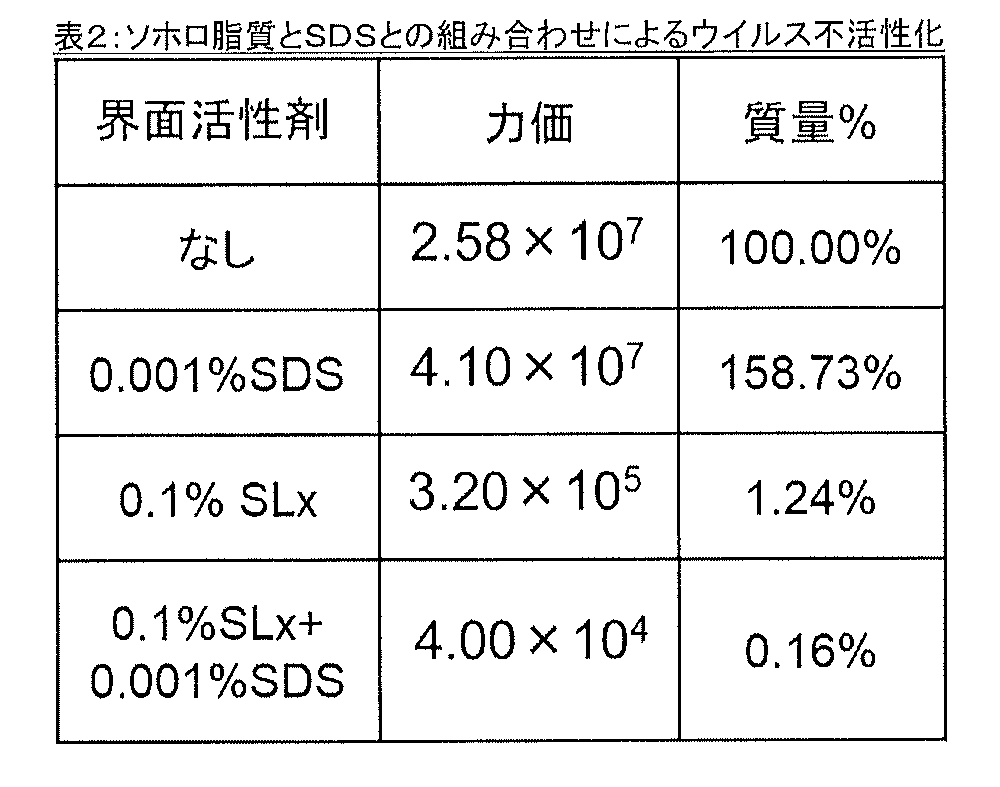 - the present inventors have also found that the combined use of sophorolipid with SDS produces an excellent virus-inactivating effect.