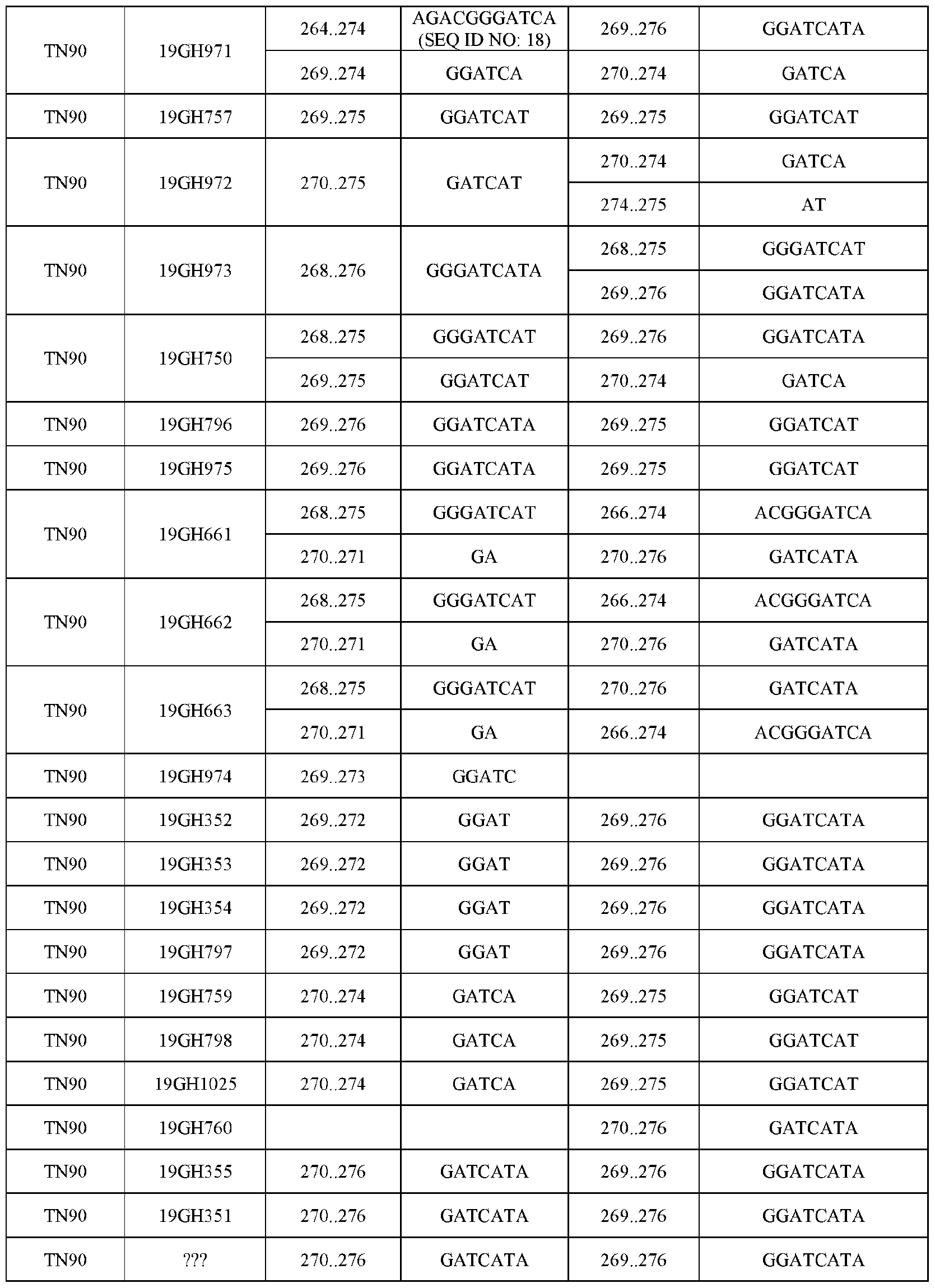 Table 10B: Mutant qpt alleles in TN90 produced by genome editing using GET. The position of each edited site (e.g., indels) is relative to the nucleotide number on the corresponding cDNA sequence of each QPT gene. For example, line 19GH752 has bi-allelic mutations in QPT2b. One of the two alleles has a 10-nucleotide deletion corresponding to nucleotide positions 266 to 275 of the QPT2b cDNA sequence. The other allele has an 8- nucleotide deletion corresponding to nucleotide positions 268 to 275 of the QPT2b cDNA sequence. SEQ ID numbers are assigned and shown for sequences of 10 or more nucleotides.