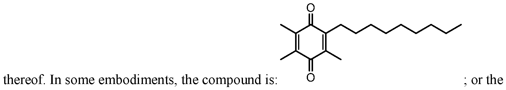 - U.S. Publication No. 2007/0072943 describes certain quinone compounds, and methods of treating certain mitochondrial disorders.