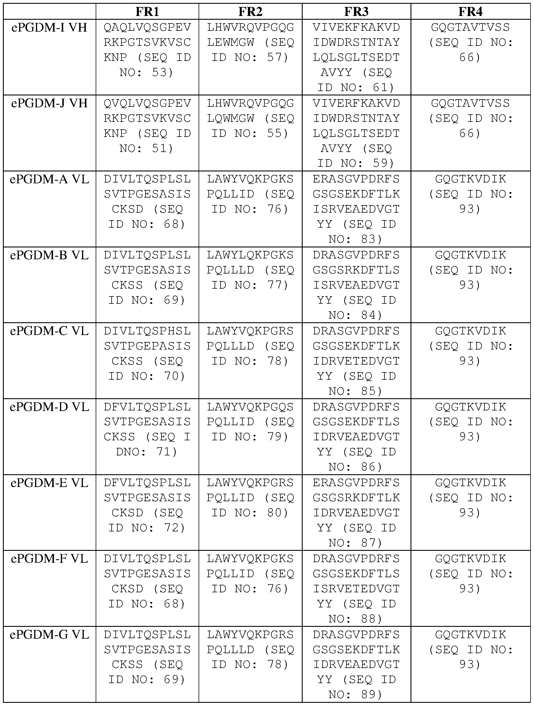 - VL FR1, VL FR2, VL FR3, and VL FR4 comprises the sequence of SEQ ID NO: 67, 75, 82, and 93, respectively; SEQ ID NO: 68, 76, 83, and 93, respectively; SEQ ID NO: 69, 77, 84, and 93, respectively; SEQ ID NO: 70, 78, 85, and 93, respectively; SEQ ID NO: 71, 79, 86, and 93, respectively; SEQ ID NO: 72, 80, 87, and 93, respectively; SEQ ID NO: 68, 76, 88, and 93, respectively; SEQ ID NO: 69, 78, 89, and 93, respectively; SEQ ID NO: 69, 79, 89, and 93, respectively; SEQ ID NO: 69, 80, 90, and 93, respectively; SEQ ID NO: 73, 80, 91, and 93, respectively;