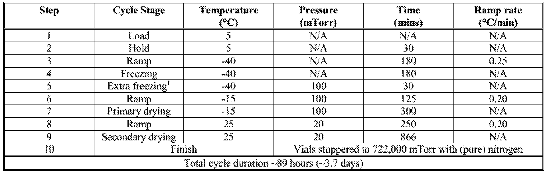 - a reduction in the sodium chloride content, use of silanised vials and a lower secondary drying temperature (to increase the final moisture content of the product) did not improve the reconstitution characteristics.