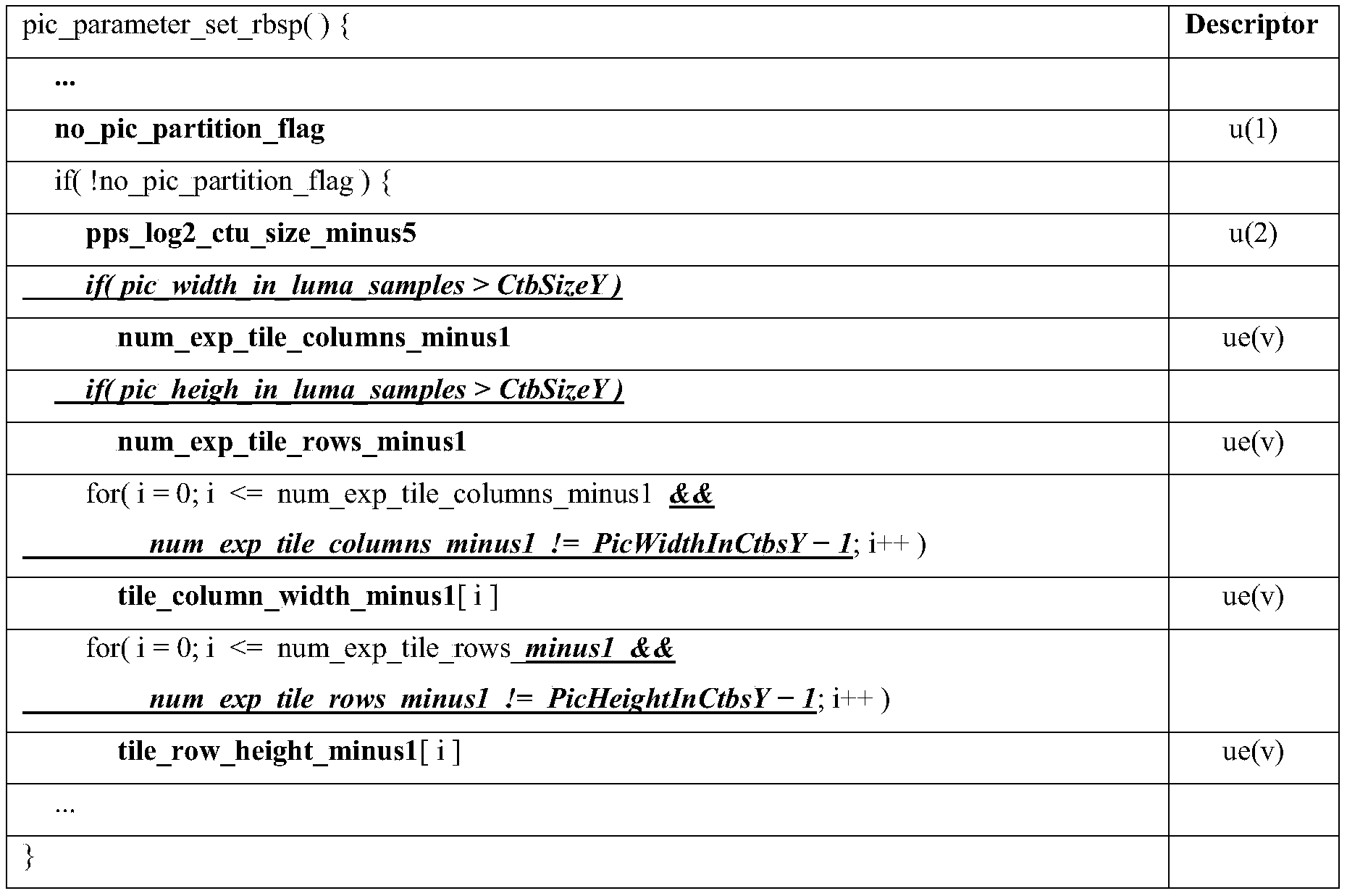 - the syntax element indicates a dimension in a unit of coding tree blocks excluding a total dimension of a number of explicitly provided tile column widths or row heights.