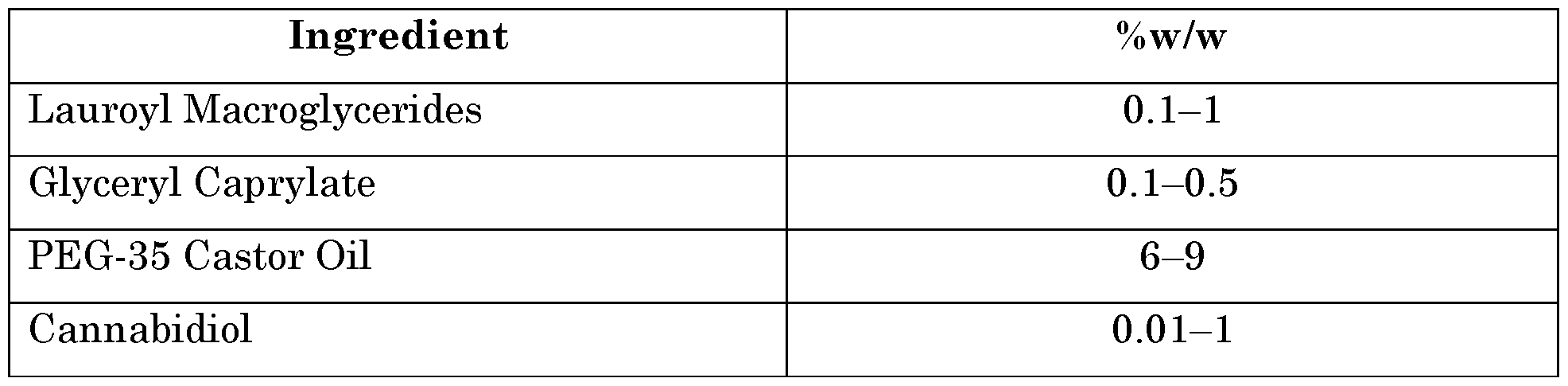 [00122] 43. The method of embodiment 42 further comprising bulk formulating the dispersed nanostructured lipid carriers to prepare formulated nanostructured lipid carriers. [00123] 44. The method of any one or more of embodiments 41–43 further comprising incorporating the processed nanostructured lipid carriers, dispersed nanostructure lipid carriers, or the formulated nanostructured lipid carriers in a soft gel. [00124] 45. A method of treating a subject comprising administering the composition of any one of embodiments 1–25 or a product of any one or more of embodiments 26–44 to a subject in need thereof. [00125] Examples [00126] The following examples illustrate particular embodiments herein, but are not limiting to the scope of the remaining embodiments described throughout the specification. [00127] As used herein, primary lipid means solid lipid and secondary lipid means liquid lipid. [00128] Example 1 [00129] Formula LR.15/17-PEG1 was created. This formula for nanostructured lipid carriers included Lauroyl Macroglycerides (primary lipid) at 0.1–1%, Glyceryl Caprylate (secondary lipid) at 0.1–1%, PEG-35 Castor Oil (co-surfactant, anti- aggregation of nanoparticles) at 6–9%, API (Active Pharmaceutical Ingredient) at 0.01–0.5%, water (solution medium, NLC former) at 60–90%, and Polysorbitan 20 (High HLB non-ionic surfactant, NLC former and stabilizer) at 6–9%. The API was CBD. Formula LR.15/17-PEG1 is shown below in Table 3. Table 3