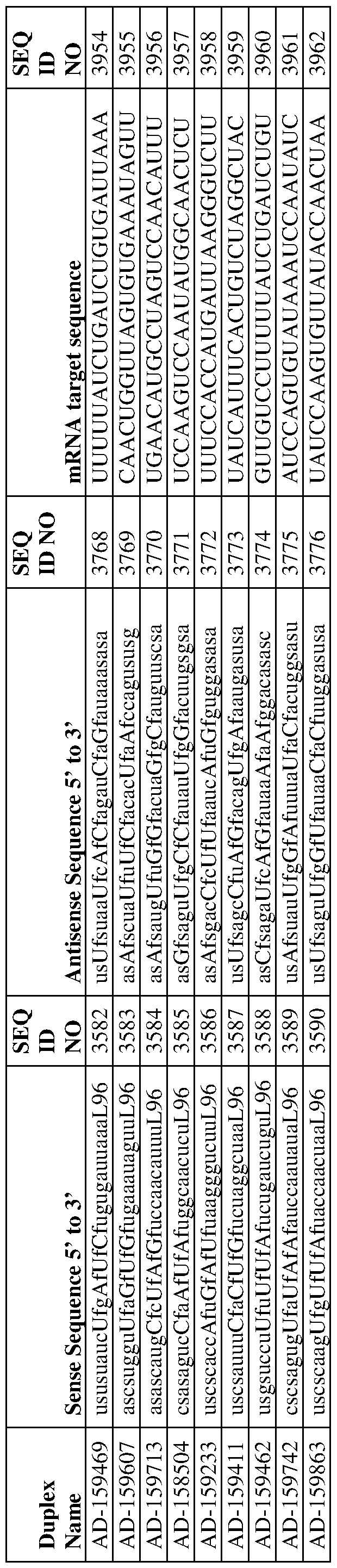 of the two sequences is complementary to the other of the two sequences, with one of the sequences being substantially complementary to a sequence of an mRNA generated in the expression of an LDHA gene. As such, in this aspect, a dsRNA will include two oligonucleotides, where one oligonucleotide is described as the sense strand (passenger strand) in any one of Tables 2-3 and the second oligonucleotide is described as the corresponding antisense strand (guide strand) of the sense strand in any one of Tables 2-3. In one embodiment, the substantially complementary sequences of the dsRNA are contained on separate oligonucleotides. In another embodiment, the substantially complementary sequences of the dsRNA are contained on a single oligonucleotide. In another aspect, a dsRNA of the invention targets an HAO1 gene and includes at least two nucleotide sequences, a sense sequence and an anti-sense sequence. The sense strand sequence is selected from the group of sequences provided in any one of Tables 4-10 and the corresponding nucleotide sequence of the antisense strand of the sense strand is selected from the group of sequences of any one of Tables 4-14. In this aspect, one of the two sequences is complementary to the other of the two sequences, with one of the sequences being substantially complementary to a sequence of an mRNA generated in the expression of an HAO1 gene. As such, in this aspect, a dsRNA will include two oligonucleotides, where one oligonucleotide is described as the sense strand (passenger strand) in any one of Tables 4-14 and the second oligonucleotide is described as the corresponding antisense strand (guide strand) of the sense strand in any one of Tables 4-14. In one embodiment, the substantially complementary sequences of the dsRNA are contained on separate oligonucleotides. In another embodiment, the substantially complementary sequences of the dsRNA are contained on a single oligonucleotide. It will be understood that, although the sequences in Tables 2-14 are described as modified, unmodified, unconjugated. and/or conjugated sequences, the RNA of the dsRNA of the invention e.g., a dsRNA of the invention, may comprise any one of the sequences set forth in any one of Table 2-14 that is un-modified, un-conjugated, and/or modified and/or conjugated differently than described therein. The skilled person is well aware that dsRNAs having a duplex structure of between about 20 and 23 base pairs, e.g., 21, base pairs have been hailed as particularly effective in inducing RNA interference (Elbashir et al., (2001) EMBO J., 20:6877-6888). However, others have found that shorter or longer RNA duplex structures can also be effective (Chu and Rana (2007) RNA 14:1714- 1719; Kim et al. (2005) Nat Biotech 23:222-226). In the embodiments described above, by virtue of the nature of the oligonucleotide sequences provided herein, dsRNAs described herein can include at least one strand of a length of minimally 21 nucleotides. It can be reasonably expected that shorter duplexes minus only a few nucleotides on one or both ends can be similarly effective as compared to the dsRNAs described above. Hence, dsRNAs having a sequence of at least 15, 16, 17, 18, 19, 20, or more contiguous nucleotides derived from one of the sequences provided herein, and differing in their ability to inhibit the expression of an LDHA gene or an HAO1 gene by not more than about 5, 10, 15,