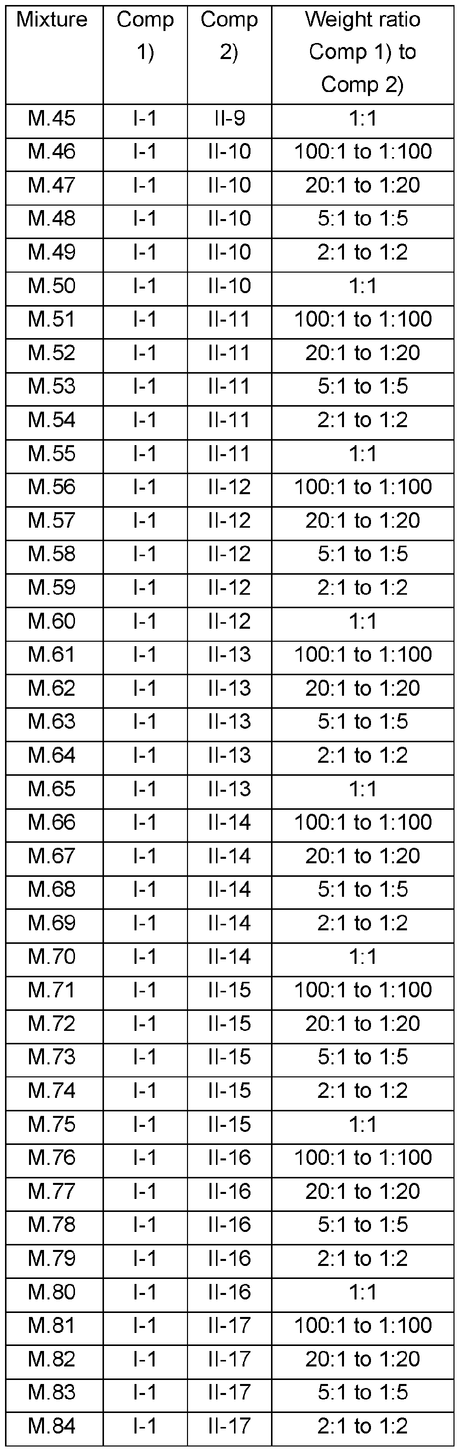 - Table T1 Mixtures M.1 to M.360 as defined in Table M, wherein each mixture additionally comprises compound II 1-1 as component 3), and whereas the weight ratio of compound I to compound 111-1 is 100:1 to 1:100.