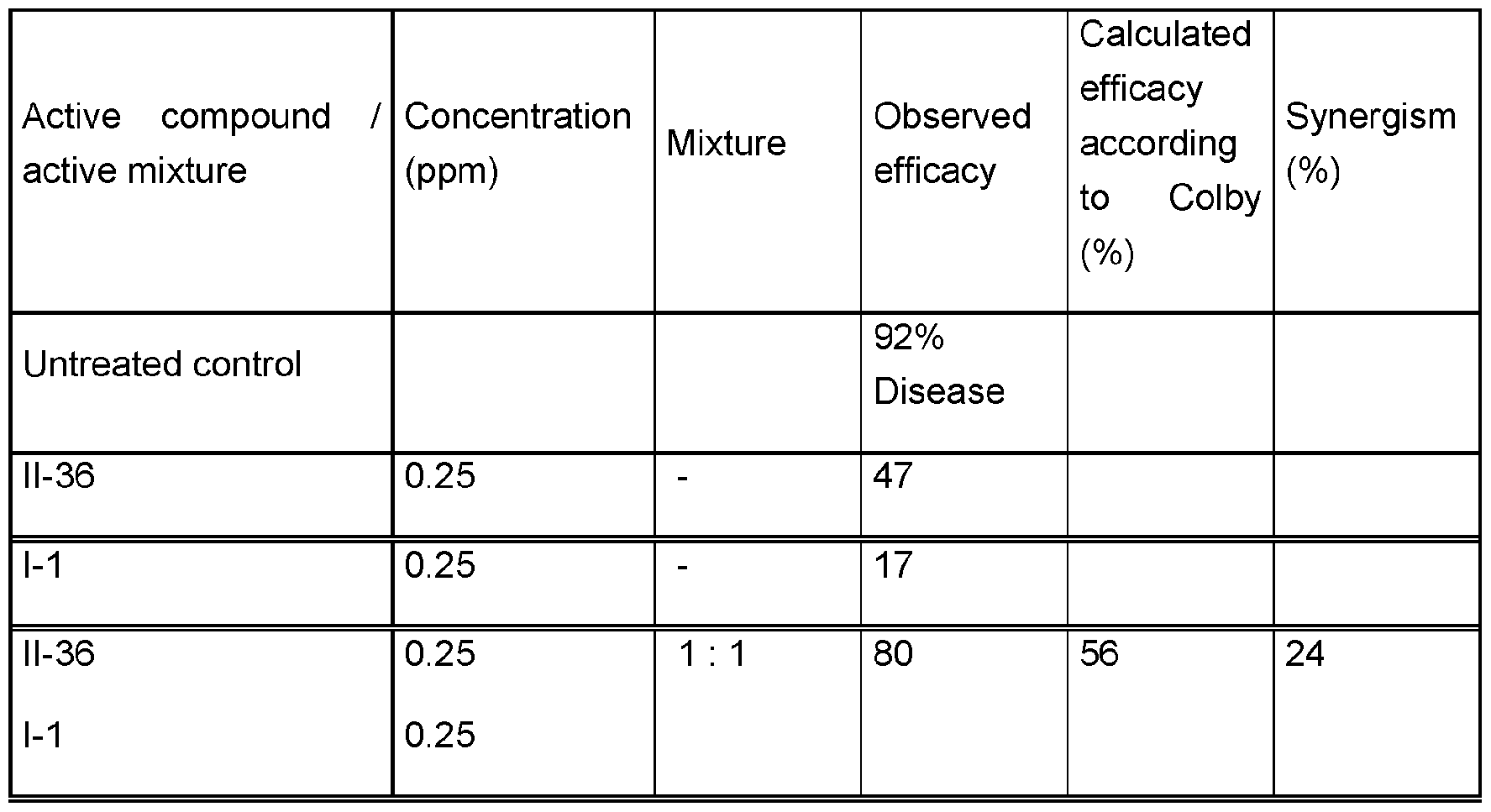 - the present invention relates to mixtures, wherein active component 1) is 1-1 , and active component 2) is a mixture of compounds 11-14 and II-36, wherein the mixture comprises at least 90% by weight based on the total amount of component 2) of compound II- 36, or an N-oxide, or an agriculturally useful salt thereof.
