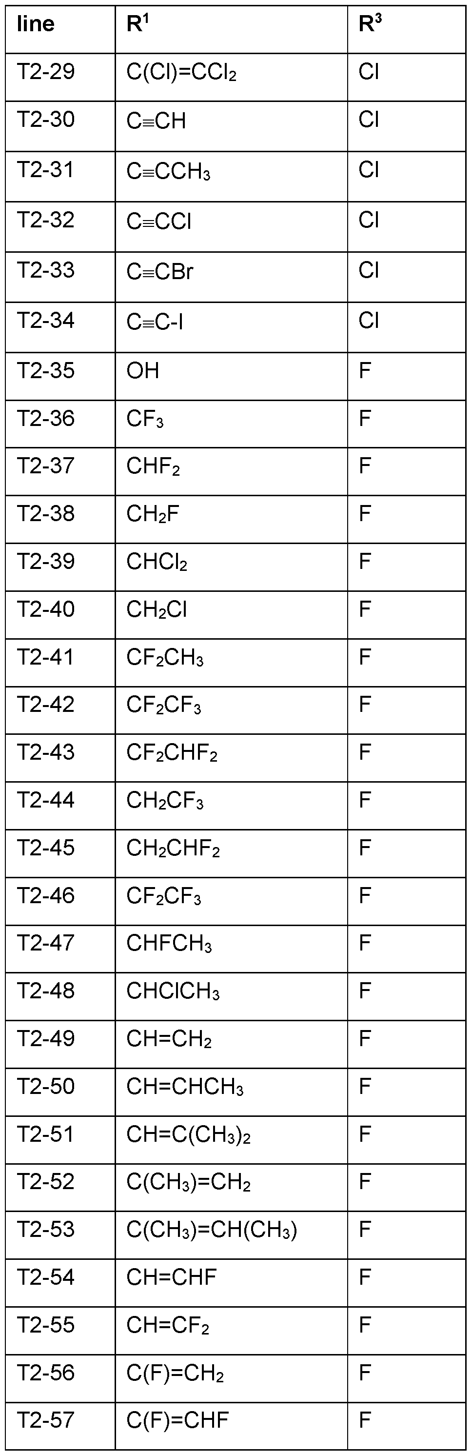 T1-3 of Table T1 and the combination of R1 and R3 for each individual compound corresponds in each case to one line of Table T2 (compounds I.A/T1-3/T2-1 to I.A/T1-3/T2-306).