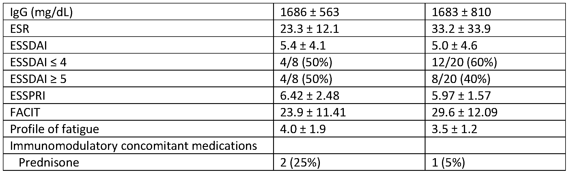 To assess differences between treatment groups (i.e., patients treated with placebo as compared to patients treated with RSLV-132) and establish baseline levels for analysis, demographics and disease characteristics were obtained prior to treatment. Analysis of patient characteristics at baseline included analysis of Complement C3 and Complement C4 levels, IgG levels (mg/dL), ESR levels, ESSDAI score, ESSPRI score, FACIT score, and profile of fatigue (ProF),