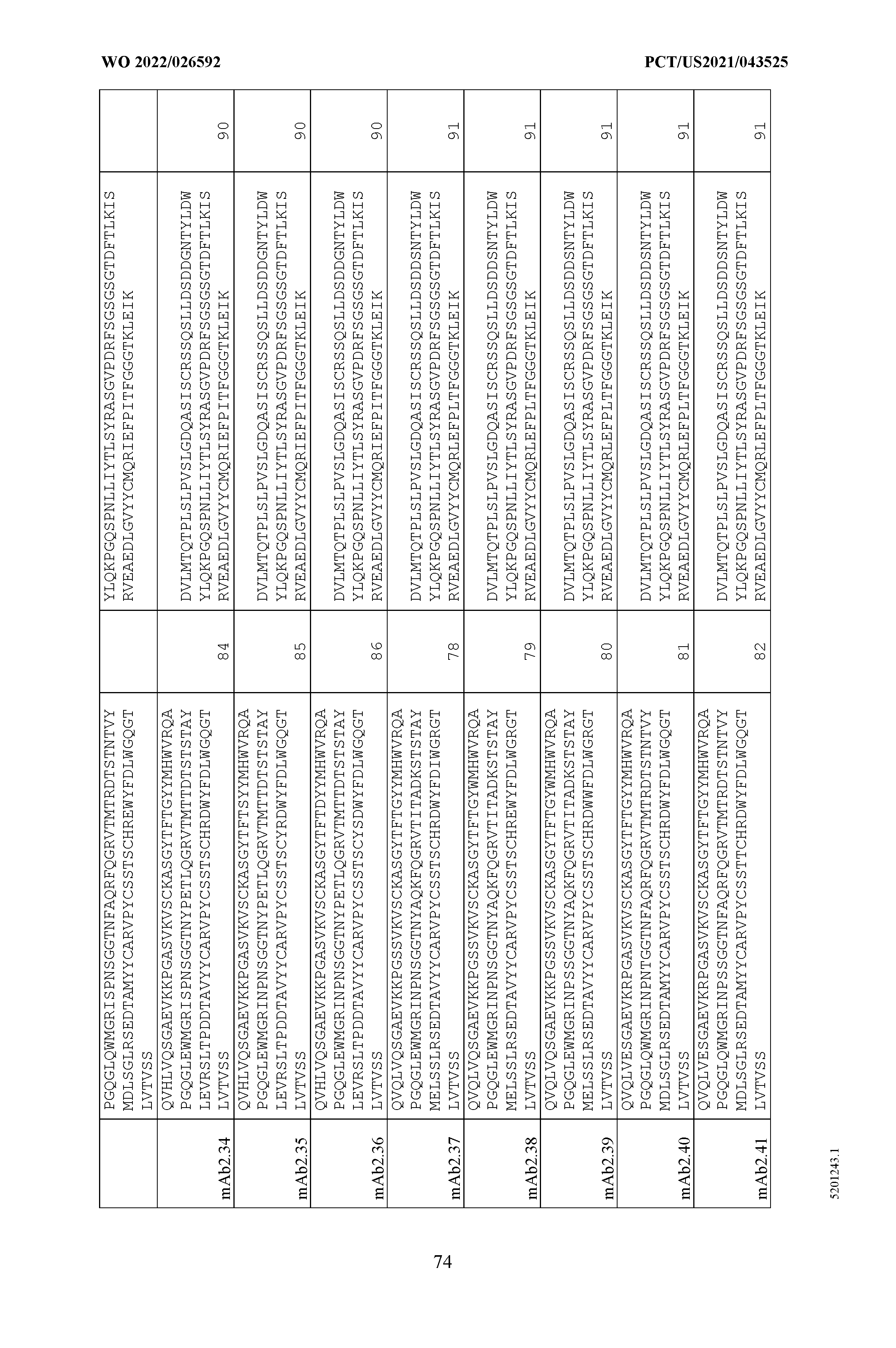 in Table 5 or a sequence substantially homologous thereto (e.g., a sequence at least about 85%, 90%, 95%, 99% or more identical thereto, and/or capable of hybridizing under the stringency conditions described herein). The portion may encode, for example, a variable region (e.g., VH or VL); one, two, or three or more CDRs; or one, two, three, or four or more framework regions. The nucleic acids disclosed herein include deoxyribonucleotides or ribonucleotides, or analogs thereof. The polynucleotide may be either single-stranded or double-stranded, and if single- stranded may be the coding strand or non-coding (antisense) strand. A polynucleotide may comprise modified nucleotides, such as methylated nucleotides and nucleotide analogs. The sequence of nucleotides may be interrupted by non-nucleotide components. A polynucleotide may be further modified after polymerization, such as by conjugation with a labeling component. The nucleic acid may be a recombinant polynucleotide, or a polynucleotide of genomic, cDNA, semisynthetic, or synthetic origin which either does not occur in nature or is linked to another polynucleotide in a non- natural arrangement. In an aspect, the application features host cells and vectors containing the nucleic acids described herein. The nucleic acids may be present in a single vector or separate vectors present in the same host cell or separate host cell, as described in more detail below. Vectors The disclosure also provides vectors that comprise a nucleotide sequence encoding an antibody molecule described herein. In an embodiment, the vector comprises a nucleotide sequence encoding an antibody molecule described herein, e.g., as described in any of Tables 1-4. The vectors include, but are not limited to, a virus, plasmid, cosmid, lambda phage or a yeast artificial chromosome (YAC). Numerous vector systems can be employed. For example, vectors can utilize DNA elements or RNA elements derived from animal viruses. Exemplary viral vectors include, but are not limited to, those derived from bovine papilloma virus, polyoma virus, adenovirus, adeno-associated virus, vaccinia virus, baculovirus, retrovirus, lentivirus, SV40 virus, Semliki Forest virus, eastern equine encephalitis virus, and flaviviruses. Additionally, cells which have stably integrated the DNA into their chromosomes may be selected by introducing one or more markers which allow for the selection of transfected host cells. The marker may provide, for example, prototropy to an auxotrophic host, biocide resistance (e.g., antibiotics), or resistance to heavy metals such as copper, or the like. The selectable marker gene can be either directly linked to the DNA sequences to be expressed or introduced into the same cell by cotransformation. Additional elements may also be needed for optimal synthesis of mRNA. These elements may include splice signals, as well as transcriptional promoters, enhancers, and termination signals.
