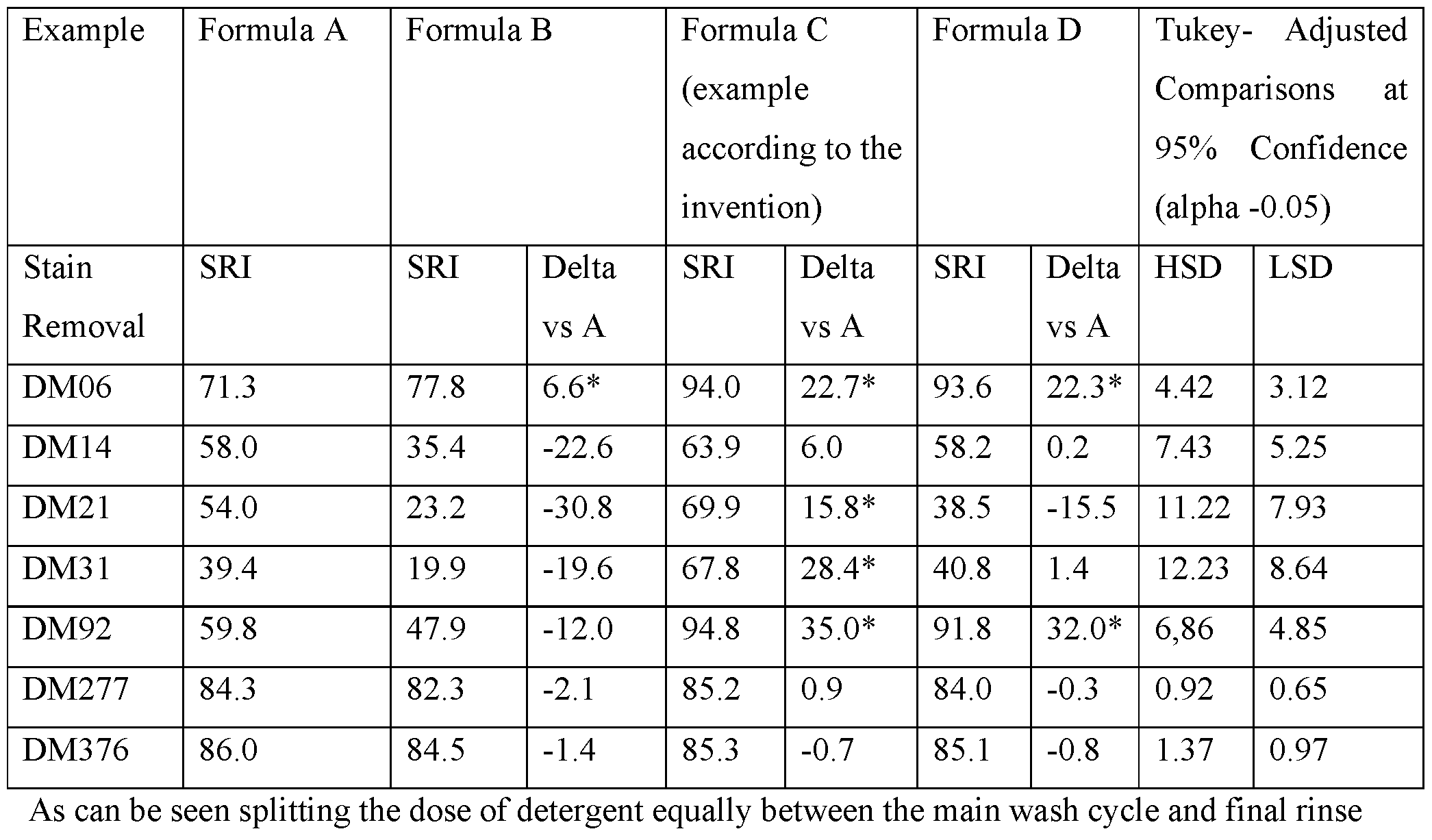 The stains were analysed before and after washing via an Image Analysis System to measure % stain removed, and stain removal index (SRI) was calculated. SRI is a 0- 100 scale with 0 = no stain removal and 100 = full removal of the soil. Averages calculated and shown herein (*denotes significance vs. comparative formula A).