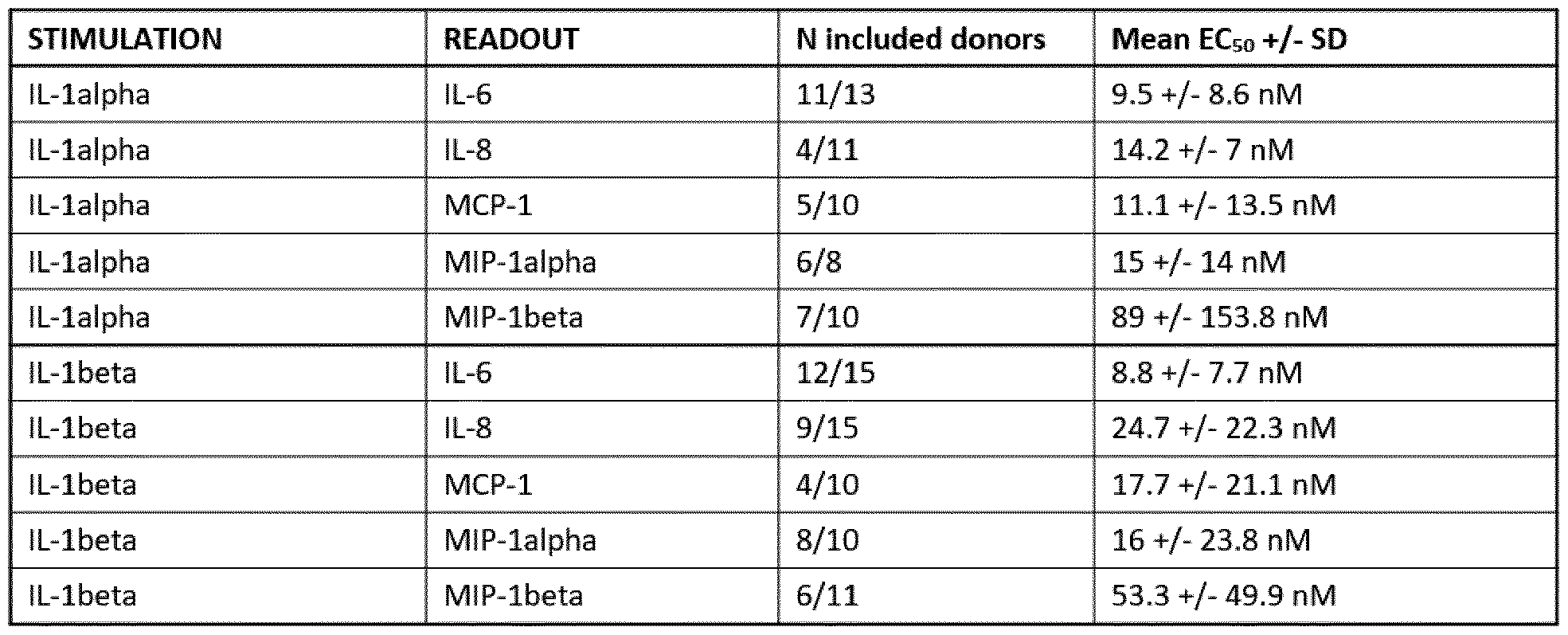 - the antibody inhibits IL-la, IL-ip, and/or IL-36P stimulated release of IL8 from primary HaCaT keratinocytic cell line; (e) the antibody inhibits IL- ip stimulated release of IL8 from primary human mononuclear cells;