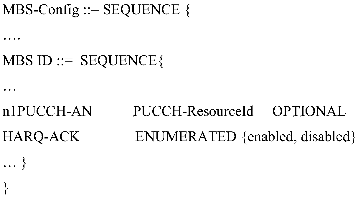 As a first option, the NACK message may be transmitted via the PUCCH. For example, the NACK message may be transmitted using an ACK/NACK PUCCH resource specifically allocated for the MBS service. E.g., the ACK/NACK PUCCH resource may include a specific combination of time/frequency resources and/or format. In some implementations, the ACK/NACK PUCCH resource may be indicated or configured via radio resource control (RRC) messaging, such as in PUCCH-Config, e.g., at 604 or at some other point. In some implementations, all of the UEs 106A-N that receive the MBS service may use the same ACK/NACK PUCCH resource. E.g., all of the UEs 106A-N may transmit simultaneously on this resource. The base station 102 may detect the energy of the PUCCH, and may determine whether any of the UEs 106A-N has transmitted an MBS NACK. This option may be well suited to scenarios in which the base station 102 will respond to a NACK by retransmitting the original MBS data communication (as opposed to responding with one or more unicast transmissions) . In other implementations, the UEs 106A-N may be organized in sub-groups, with a distinct ACK/NACK PUCCH resource configured for each sub-group. In this way, the base station may easily determine the subset of UEs from which the NACK was transmitted, and may respond to a NACK by retransmitting (e.g., as unicast communications) to only the applicable subset (s) . One non-limiting example of an RRC information element (IE) structure for use in configuring a common PUCCH resource for an MBS service is as follows: