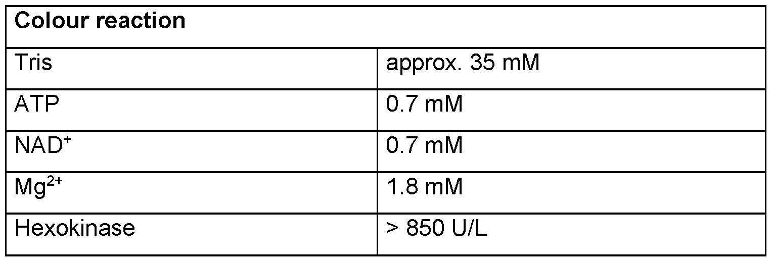 Glucose is phosphorylated by ATP, in a reaction catalyzed by hexokinase. The glucose-6- phosphate formed is oxidized to 6-phosphogluconate by glucose-6-phosphate dehydrogenase. In this same reaction, an equimolar amount of NAD+ is reduced to NADH with a resulting increase in absorbance at 340 nm. An autoanalyzer system such as Konelab 30 Analyzer (Thermo Fisher Scientific) may be used.