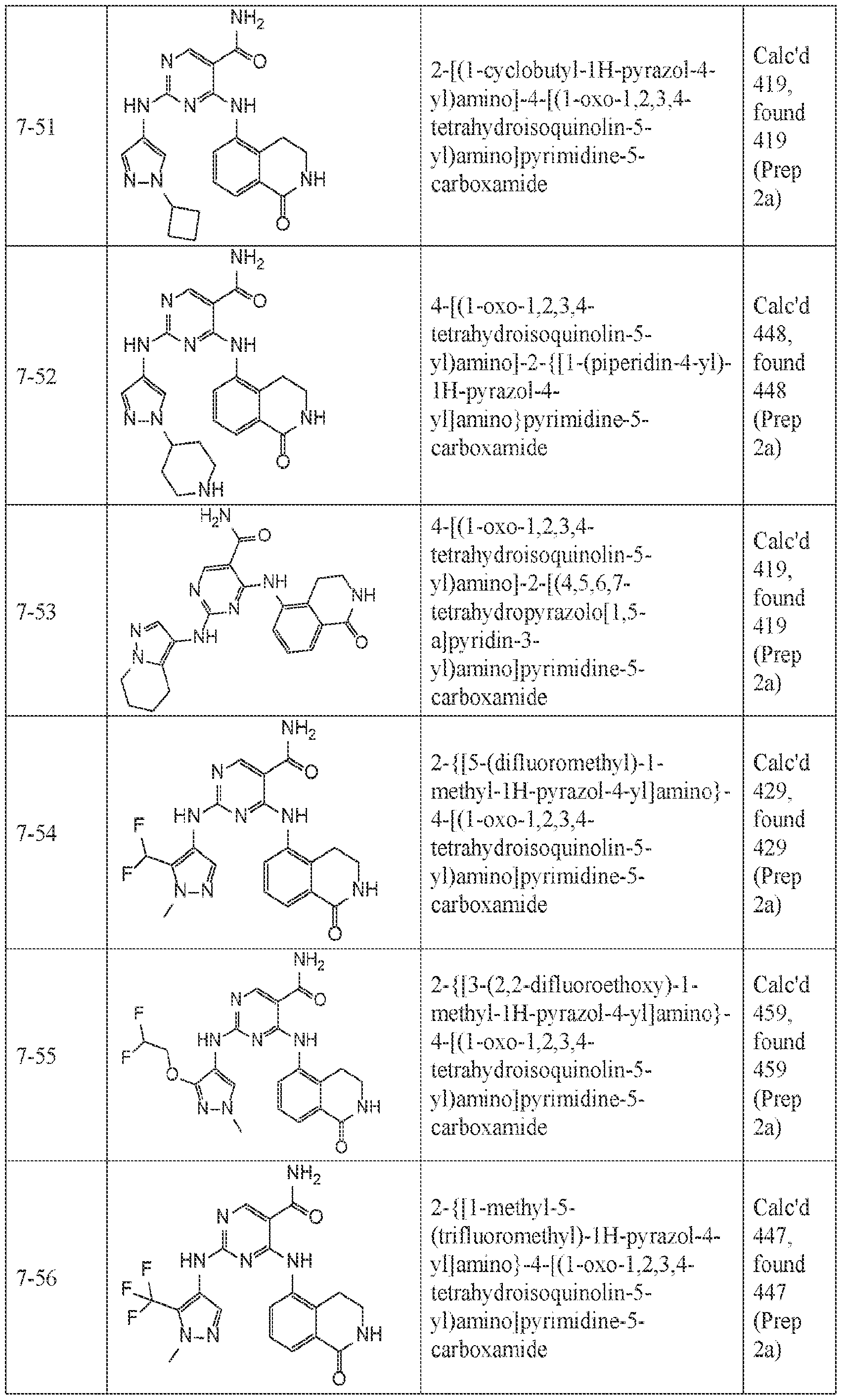 2-[(4-ethylphenyl)amino]-4-[(1-oxo-1,2,3,4-tetrahydroisoquinolin-5- yl)amino]pyrimidine-5-carboxamide; 2-[(3-fluorophenyl)amino]-4-[(1-oxo-1,2,3,4-tetrahydroisoquinolin-5- yl)amino]pyrimidine-5-carboxamide; 2-[(2,3-dimethylphenyl)amino]-4-[(1-oxo-1,2,3,4-tetrahydroisoquinolin-5- yl)amino]pyrimidine-5-carboxamide; 2-[(4-cyclopropyl-3-methylphenyl)amino]-4-[(1-oxo-1,2,3,4-tetrahydroisoquinolin-5- yl)amino]pyrimidine-5-carboxamide; 2-[(4-cyclopropylphenyl)amino]-4-[(1-oxo-1,2,3,4-tetrahydroisoquinolin-5- yl)amino]pyrimidine-5-carboxamide; 2-[(naphthalen-1-yl)amino]-4-[(1-oxo-1,2,3,4-tetrahydroisoquinolin-5- yl)amino]pyrimidine-5-carboxamide; 2-[(2-ethylphenyl)amino]-4-[(1-oxo-1,2,3,4-tetrahydroisoquinolin-5- yl)amino]pyrimidine-5-carboxamide; 2-{[3-(difluoromethoxy)phenyl]amino}-4-[(1-oxo-1,2,3,4-tetrahydroisoquinolin-5- yl)amino]pyrimidine-5-carboxamide; 2-[(2,4-difluorophenyl)amino]-4-[(1-oxo-1,2,3,4-tetrahydroisoquinolin-5- yl)amino]pyrimidine-5-carboxamide; 4-[(1-oxo-1,2,3,4-tetrahydroisoquinolin-5-yl)amino]-2-{[3- (trifluoromethyl)phenyl]amino}pyrimidine-5-carboxamide; 2-[(3-methylphenyl)amino]-4-[(1-oxo-1,2,3,4-tetrahydroisoquinolin-5- yl)amino]pyrimidine-5-carboxamide; 2-[(3-tert-butylphenyl)amino]-4-[(1-oxo-1,2,3,4-tetrahydroisoquinolin-5- yl)amino]pyrimidine-5-carboxamide; 2-{[3-chloro-4-(difluoromethoxy)phenyl]amino}-4-[(1-oxo-1,2,3,4- tetrahydroisoquinolin-5-yl)amino]pyrimidine-5-carboxamide; 2-[(3,5-dimethylphenyl)amino]-4-[(1-oxo-1,2,3,4-tetrahydroisoquinolin-5- yl)amino]pyrimidine-5-carboxamide; 2-{[1-(2-fluorophenyl)cyclopropyl]amino}-4-[(1-oxo-1,2,3,4-tetrahydroisoquinolin-5- yl)amino]pyrimidine-5-carboxamide; 2-{[(2,6-dichlorophenyl)methyl]amino}-4-[(1-oxo-1,2,3,4-tetrahydroisoquinolin-5- yl)amino]pyrimidine-5-carboxamide; 2-[(3-cyclopropylphenyl)amino]-4-[(1-oxo-1,2,3,4-tetrahydroisoquinolin-5- yl)amino]pyrimidine-5-carboxamide;