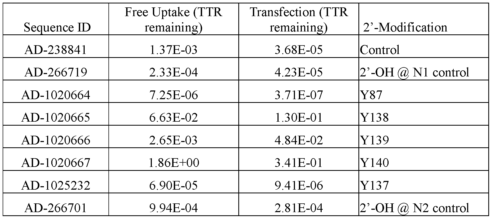 [0629] Free uptake procedure: siRNAs containing 2’-modifed nucleoside analogous (Table 2) were incubated with primary mouse hepatocytes at 0.1, 1, 10, and 100 nm concentrations in cell culture medium and analyzed after 48 hours. TTR message remaining was determined by qPCR.