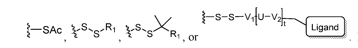 t is an integer of 1-3 representing the number of presence for unit [U-V2], which can be the same or different for each occurrence; and indicates the attachment of the formula (I) to the 2’ -position of the nucleoside.