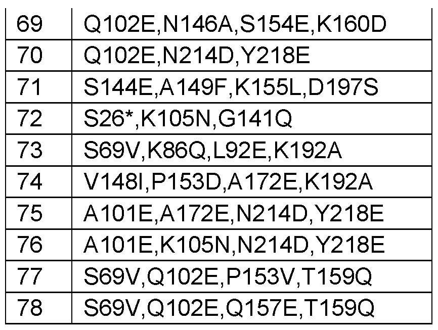 - NO: 1 for example at least two alterations selected from the group consisting of S26*, D32Q, K36C,H, G37R, F43W, D46G, A55I, N68D, S69V, A76I, K82S,T, P84D.T, K86G,L,N,Q,T,V,Y, A91R, L92E, K95I, P97E.N, A101E, Q102E, K105N,G,Q,T,D, F112Y.W, L129K, N133Q, V138C, N140H, G141Q.R, S144E, N146A, K147N.E, V148I, A149D,E,F, Q150D, P153D.V, S154E, K155E,F,L,S,T, Q157D.E, Q158D, T159Q, K160D, T170Q, A172D,E,H,R, K185*, V187N.Y, N 191 *